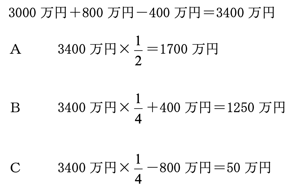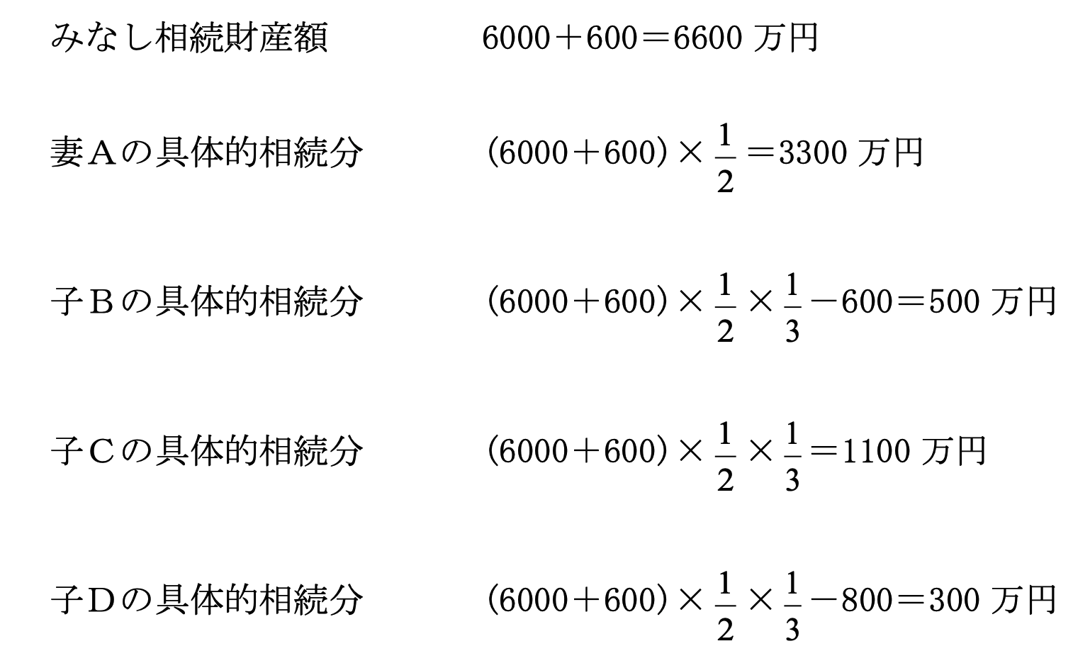 最近の家庭裁判所の審判例では、 両規定を同時に適用したものが見受けられます。 この見解によれば、 例えば、 相続財産の価額 3000 万円、 相続人は 妻A、 子B、 Cの3名、 Bに寄与分400万円が認められ、 Cには800万円の生 前贈与がある場合には、