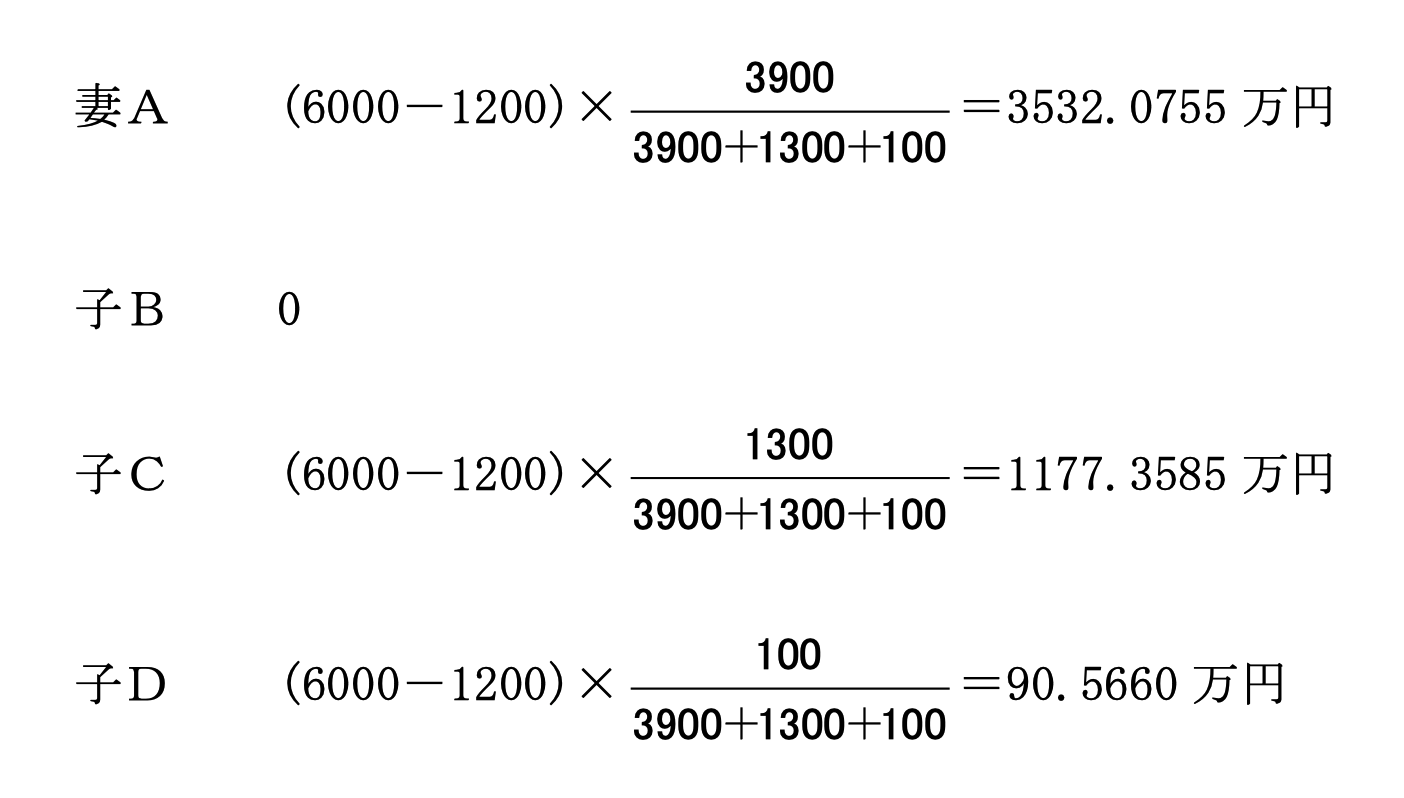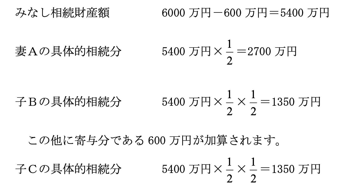 相続財産の価額 6000 万円、 相続人は妻 A、 子 B、 C の3名で、 B に寄与分 600 万円が定められた場合