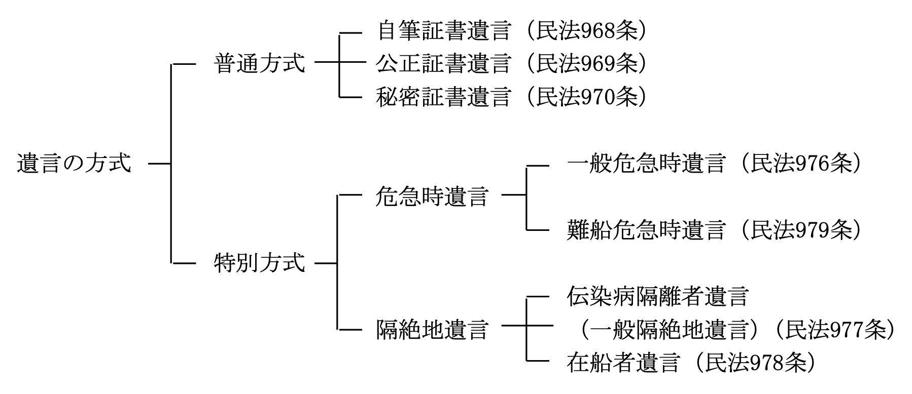 遺言事項は、 a.信託法上の信託の設定 (信託法 3 条 2 項)、 b.財産処分すなわち遺贈 (民法964条) 及び一般財団法人の設立・財産の拠出 (一般社団・財団法人 法 152 条2項、157 条1項)、 c.子の認知 (民法 781 条 2 項)、 d.相続人の廃除 又はその取消 (民法 893 条、 894 条 2 項)、 e.祭祀の承継者の指定 (民法 897 条)、 f.生命保険受取人の変更(保険法 44 条1項)、 g.遺言執行者の指定又は指定の 委託 (民法 1006 条1項)、 h.後見人又は後見監督人の指定 (民法 839 条1項及び 民法 848 条)、 i.相続分の指定又は指定の委託 (民法 902 条1項)、 j.遺産分割 方法の指定又は指定の委託 (民法908条)、 k.遺産分割の禁止 (民法908条)、 l. 相続人の担保責任の指定 (民法 914 条)とされています。