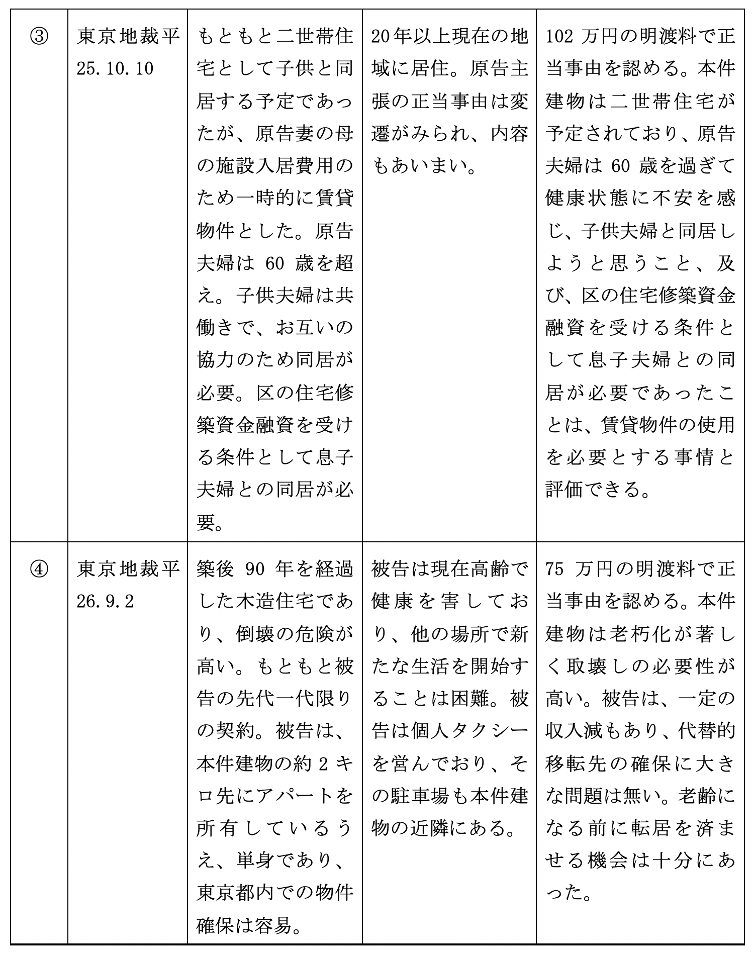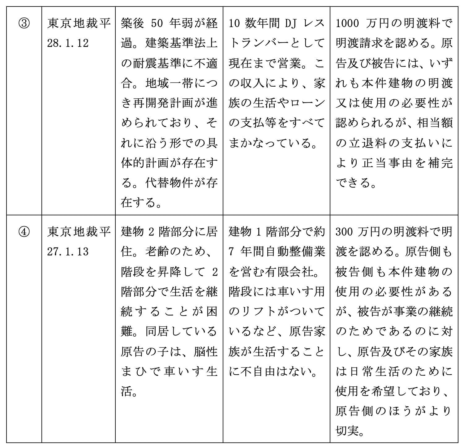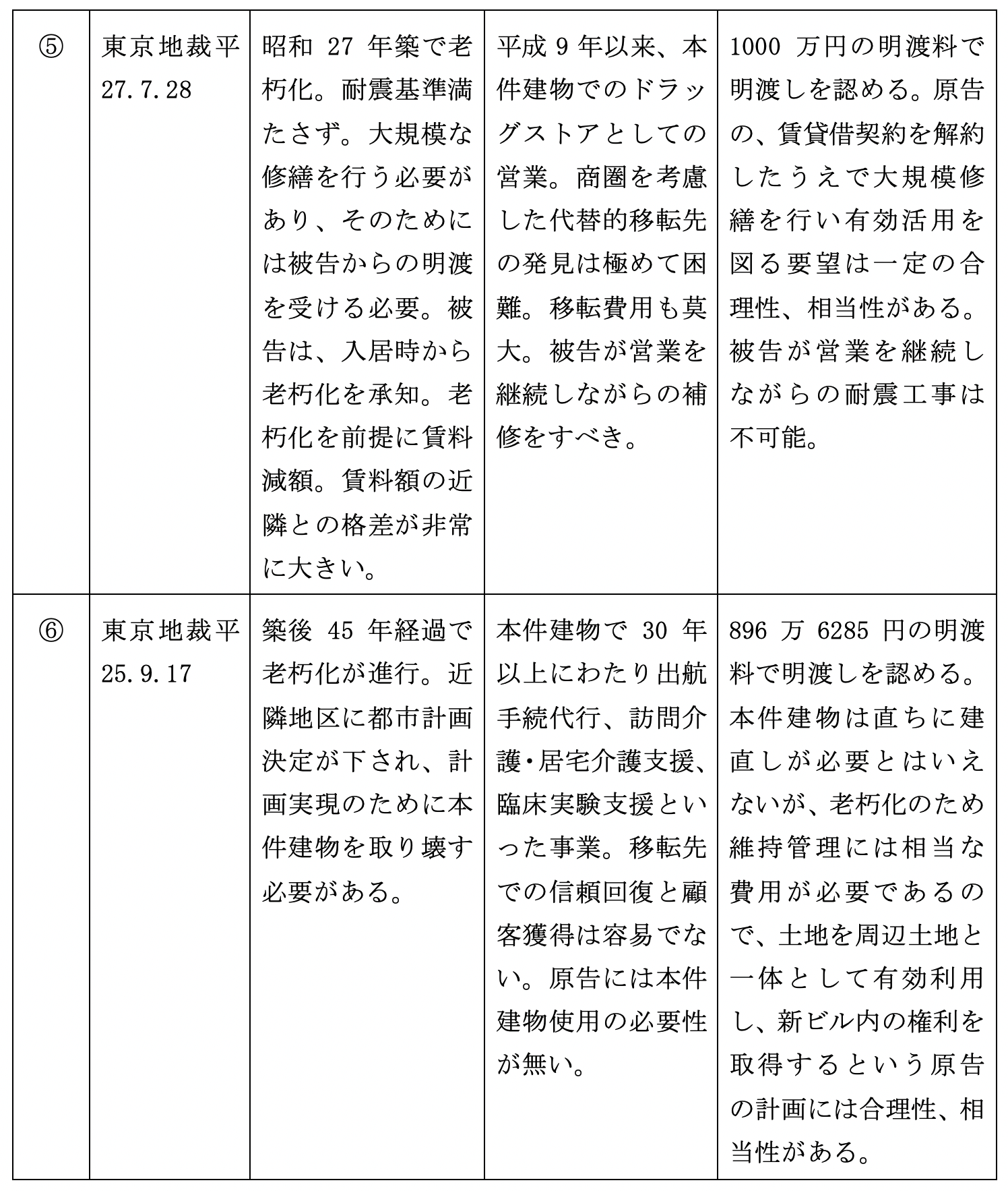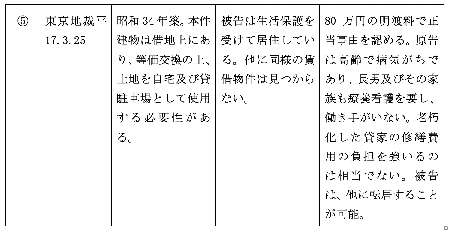 また、建物が大正年代の末ころ築造され、現在屋根の全面的葺替え、一部柱の根継ぎ、一部土台・基礎・敷居の入替え、天井の貼替え、根太の補修等の大修繕を必要とし、朽廃に至っているとはいえないにしてもほぼ5年前後で朽廃に至る状況にあるというケースで、裁判所は、「本件建物に必要とする大修繕は、その費用と修繕後の建物の効用などを比較考慮すると、これを施すことは現実的でなく建て替えるほかはない段階に至っていることが認められる」 として、借家権価格の約4分の1にあたる700万円の明渡料の支払を条件として明渡請求を認めました (東京地判昭63.9.16判時1312号124頁)。  以上のように、建物の老朽化という事実だけでは正当事由として不十分であるとしても、明渡料の支払によって正当事由が補完される場合が大変多いといえます。
