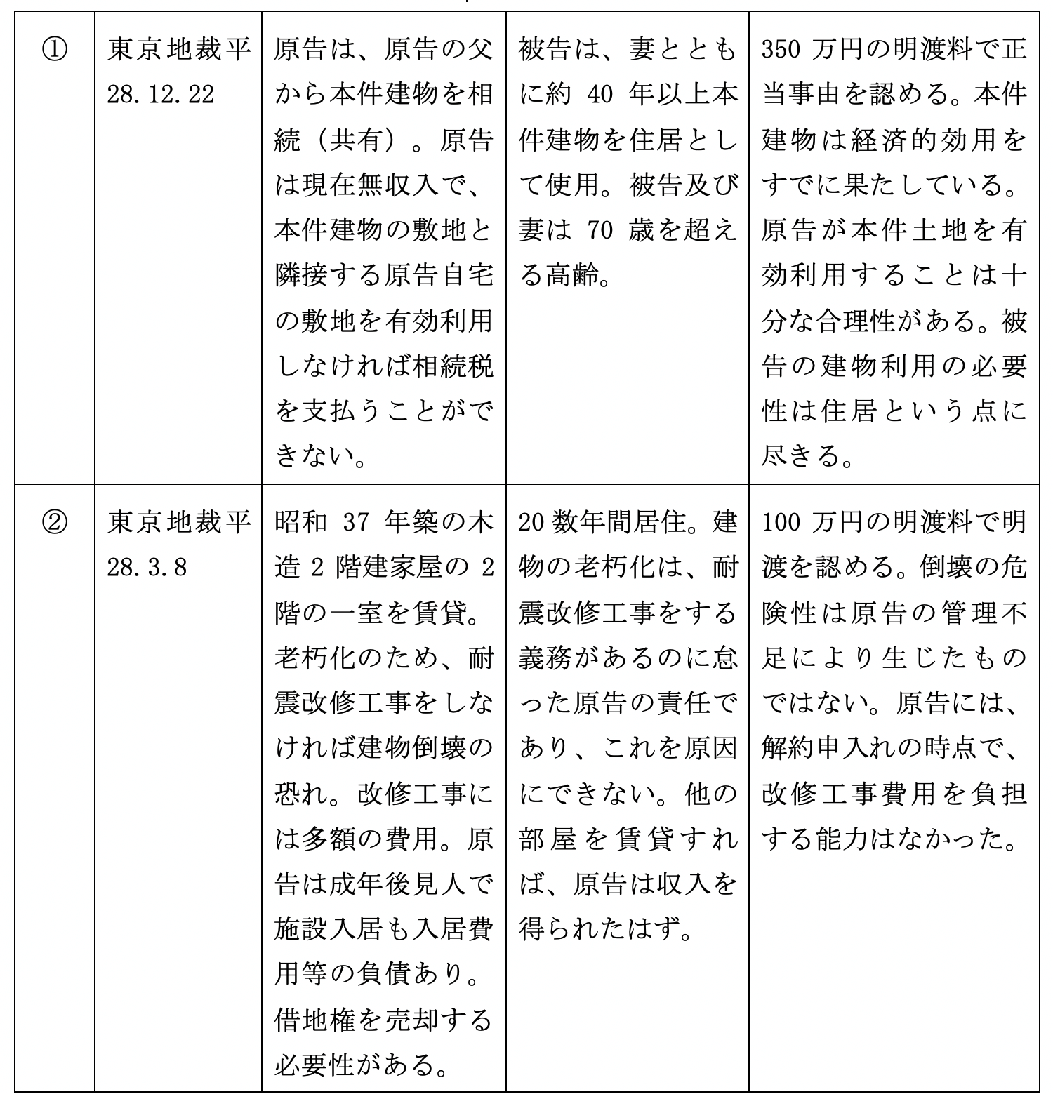 例えば、大正12、3年ころ建築された木造建物で、建物の各所にわたって朽廃化の状態が顕著で、構造的にも物理的にも安全といえない状態にあるというケースで、裁判所は、「原告が本件建物を取り壊すことは建物の現況に照らしやむをえないものというべきであり、その跡地に建物を新築することと相まって、本件建物の存する地域、場所の実情に相応した敷地の有効な利用を図るものとして、その必要性を肯認することができ、解約申入の正当事由を構成するに足りるものということができる。」 として、明渡料の支払を条件とすることなく正当事由を認めました (東京地判昭63.10.25判時1310号116頁)。