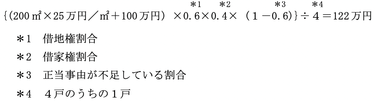 更地価格25万円/㎡する200㎡の敷地上に建つ貸家4軒長屋 (建物価100万円) の1戸の明渡しを求めるにつき、 家主側の正当事由が60%備わっている場合の明渡料は、 122万円と一応試算することがきます。