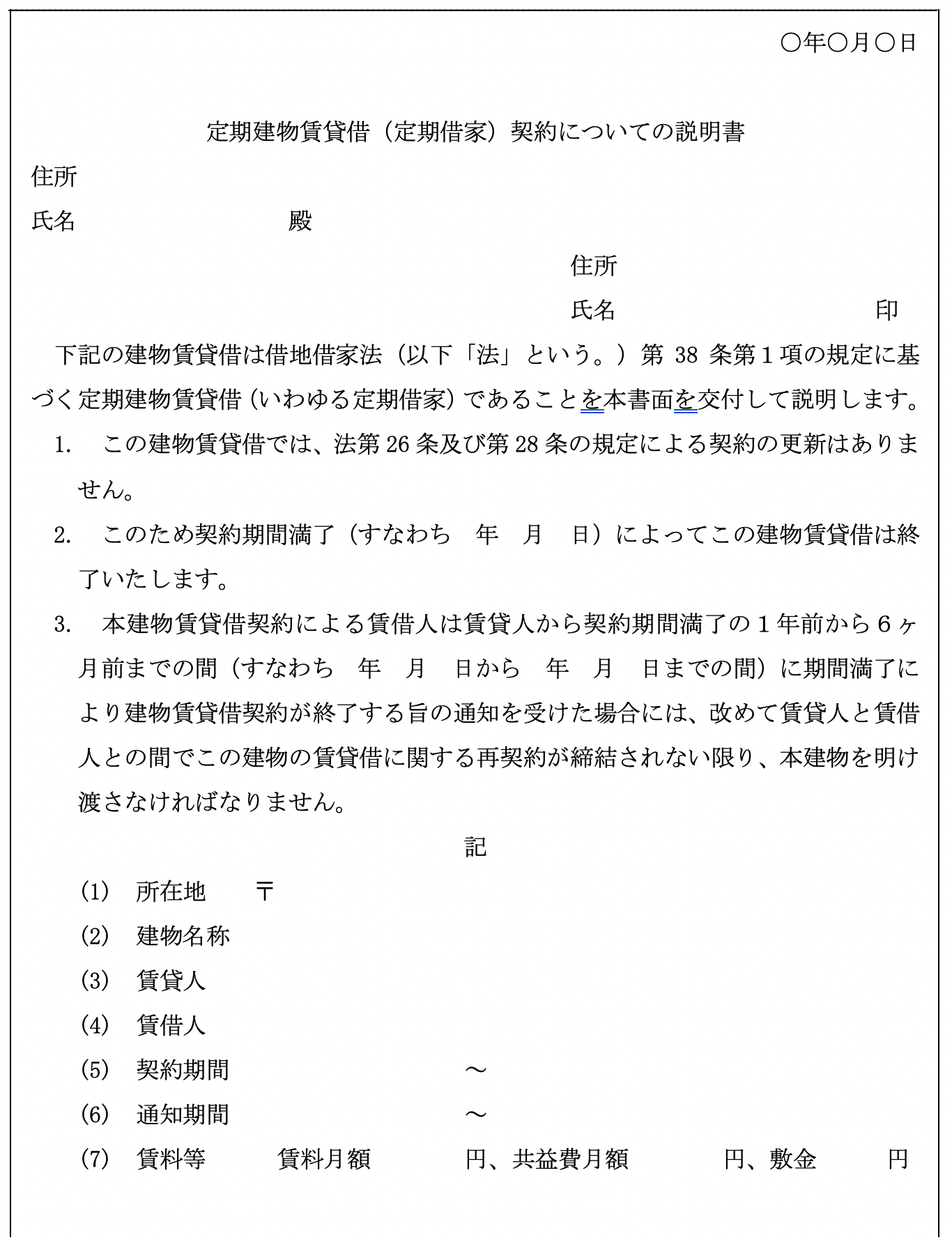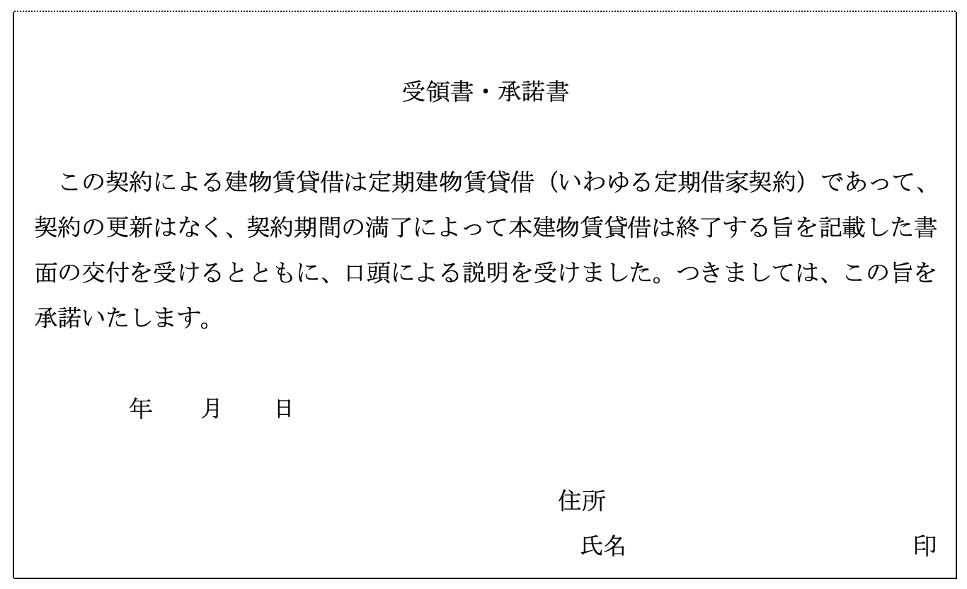また、 借地借家法第38条第2項の書面を交付して説明しなければ、 当該賃貸借契約には更新がない旨の定めが無効になります (借地借家法第38条第3項) から、 賃貸人は賃借人からこれらの事前説明書面に基づき、 定期借家であることの説明を受け、 その旨の書面も受領したことを記載した書類をもらっておくことが、 後日、 説明や書面の交付についての争いを防ぐためにも必要です。