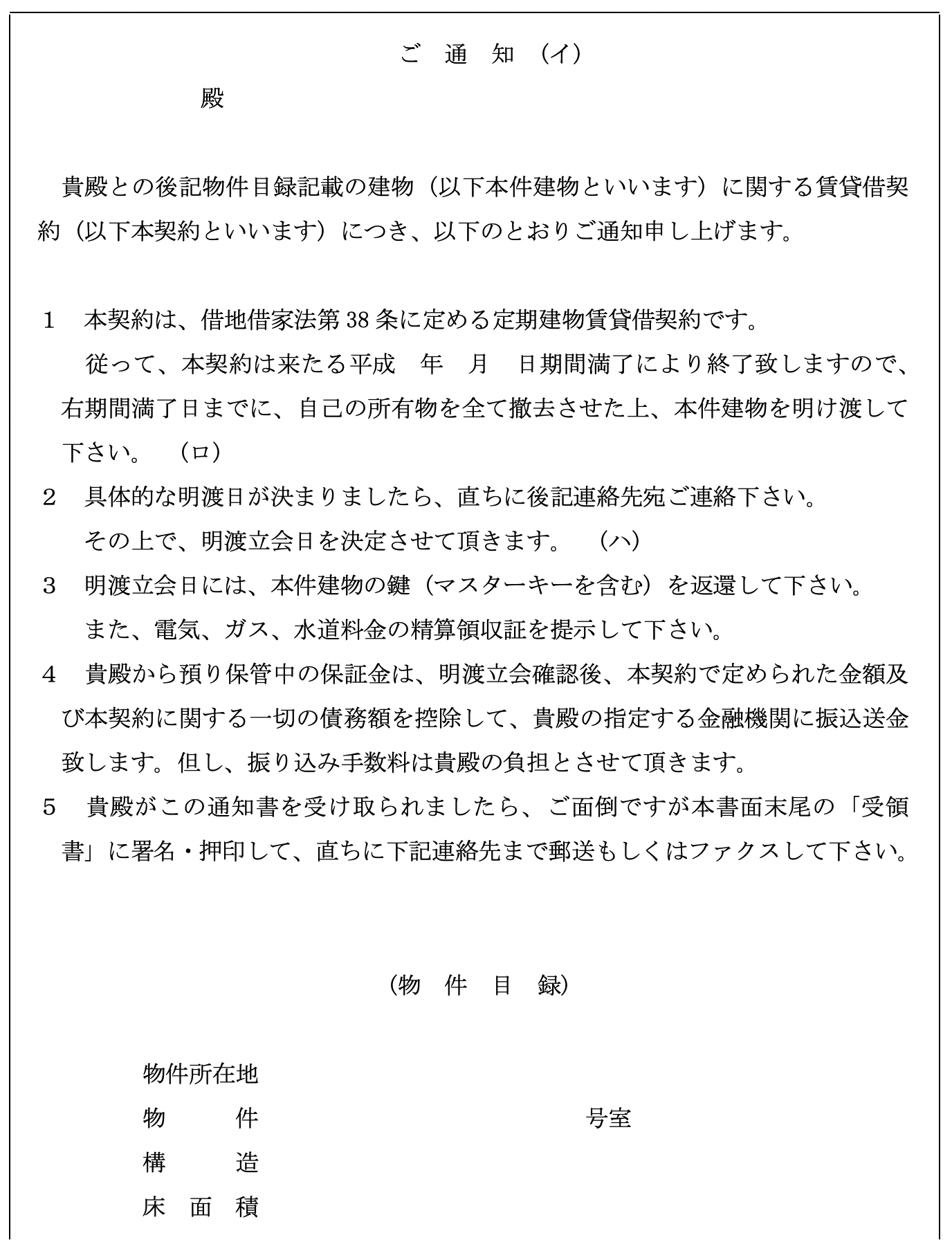期間満了による定期建物賃貸借終了の通知書