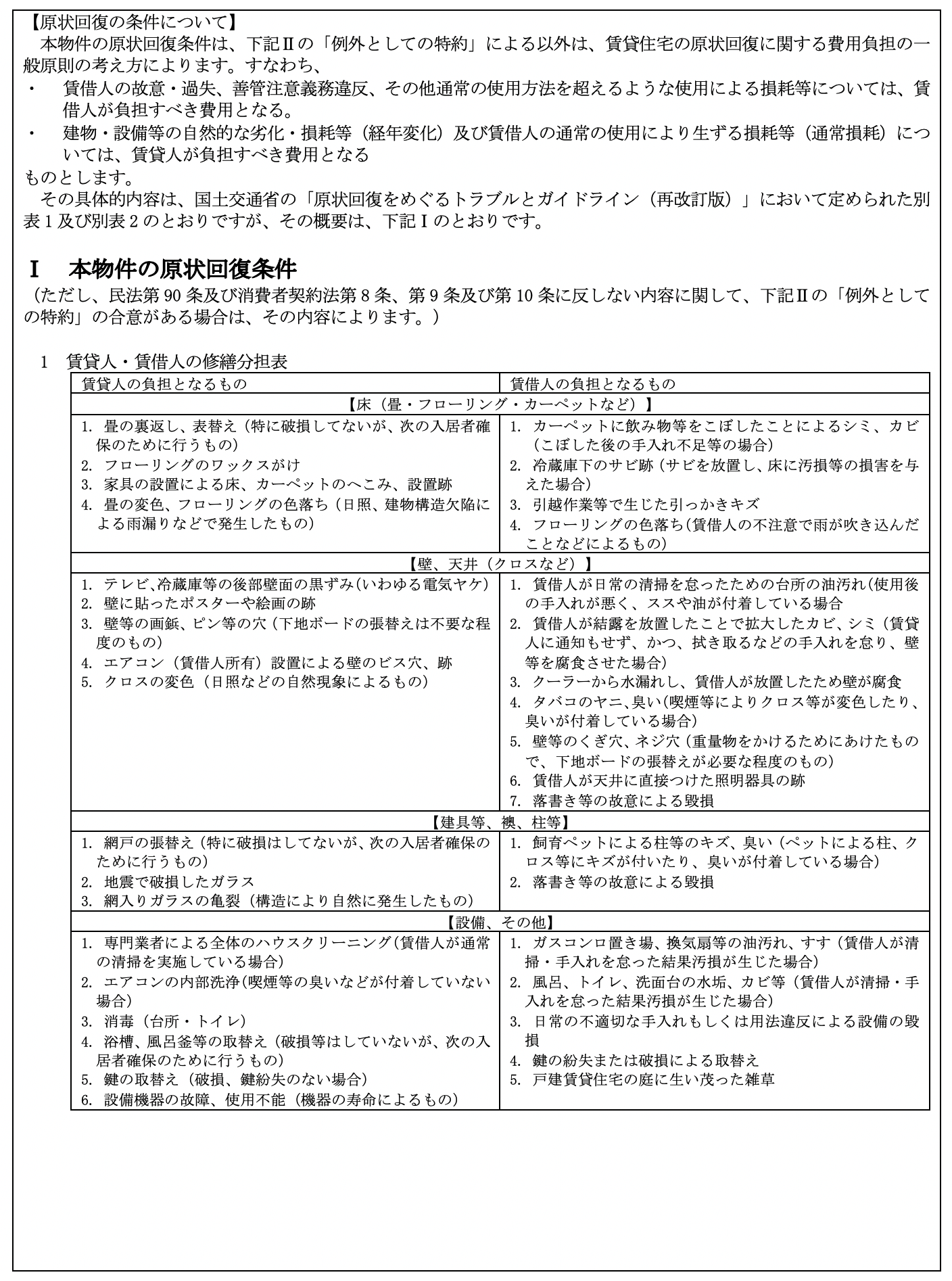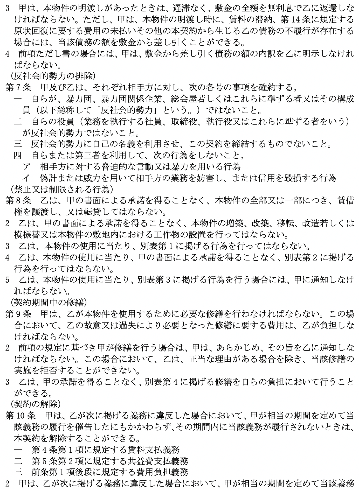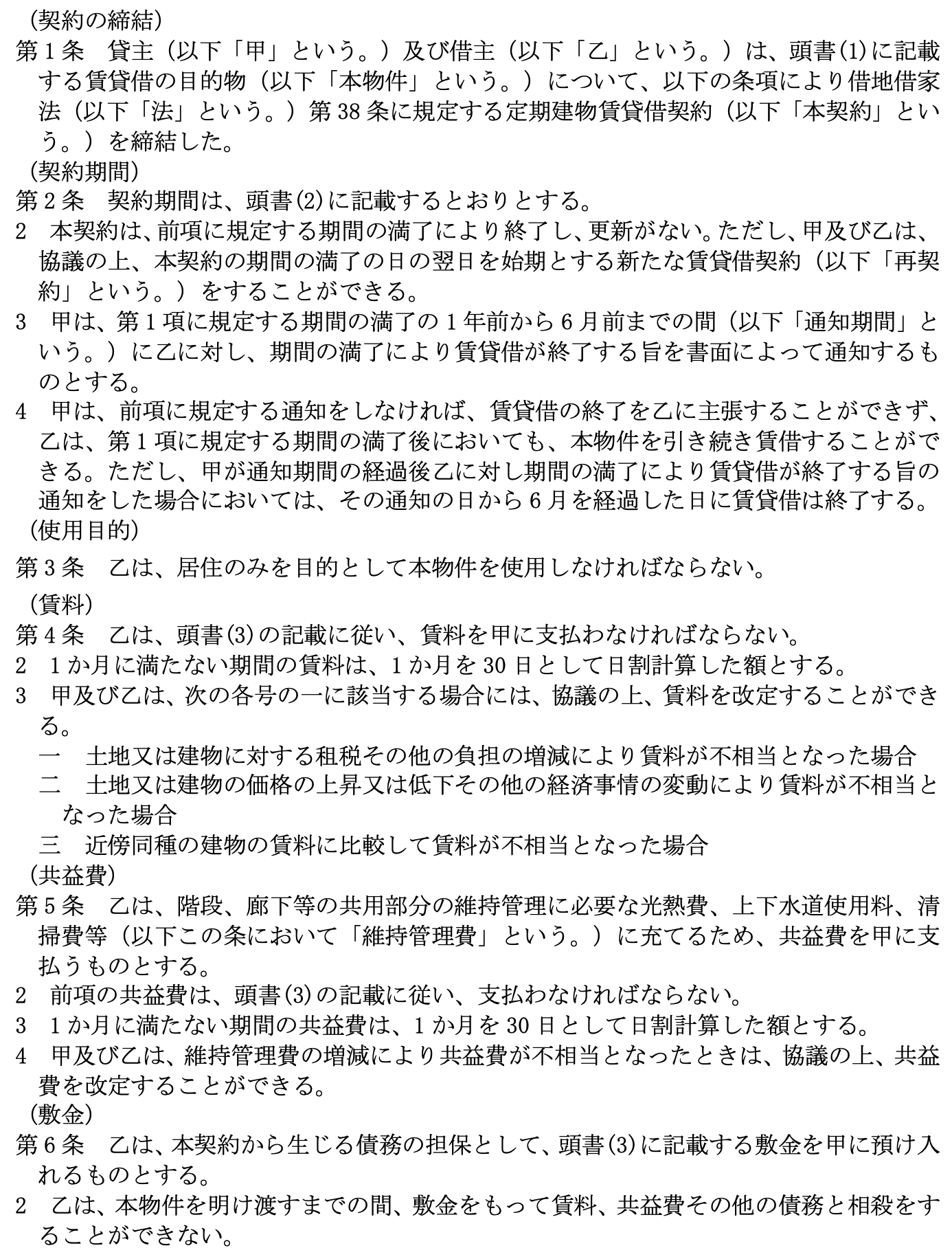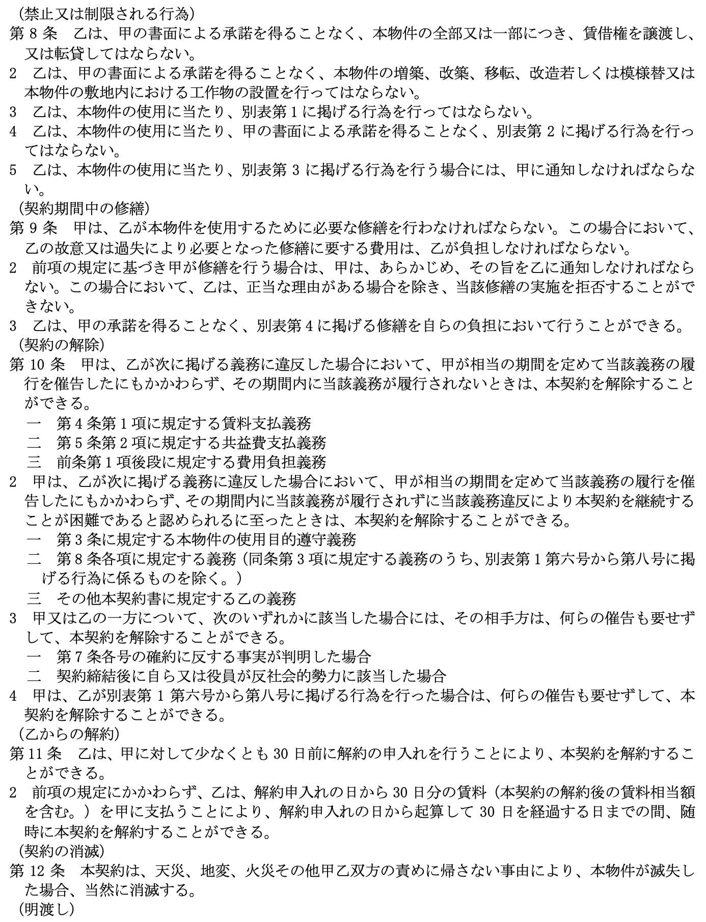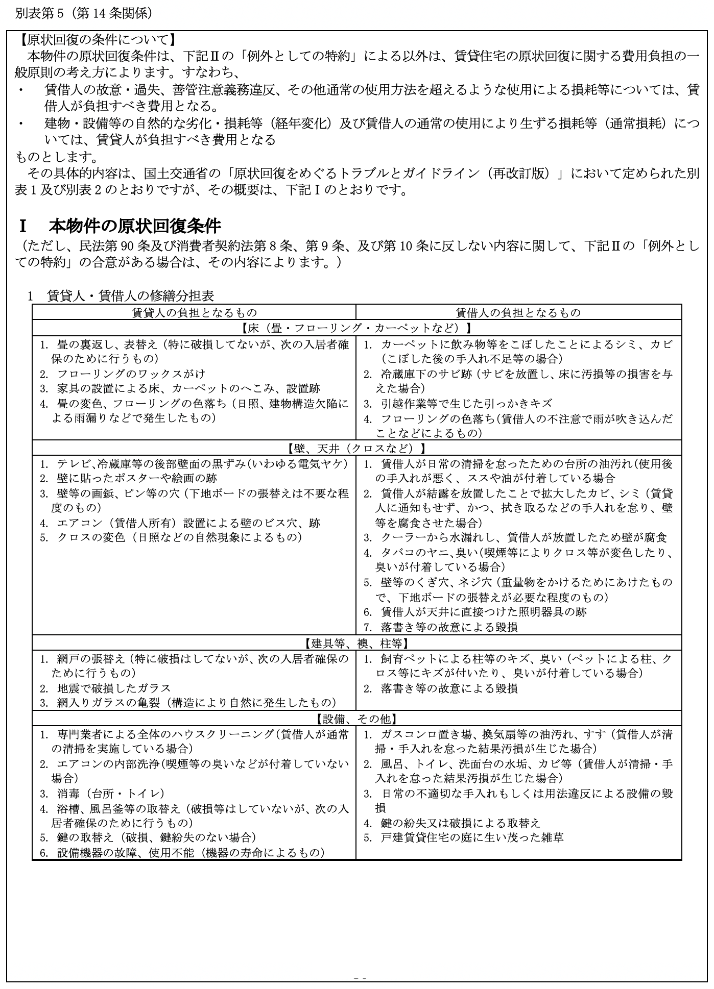 となっています。 尚、 比較の便のため、 第5として国土交通省作成にかかる普通賃貸借契約標準契約書式並びに関連書式を添付しました。