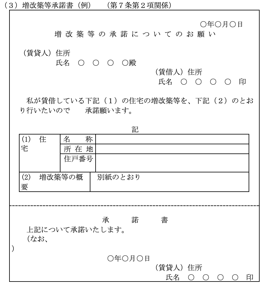 国土交通省において 「定期賃貸住宅標準契約書」 と関連書類の書式を作成しているので、 参考資料として以下に掲記しておきます。