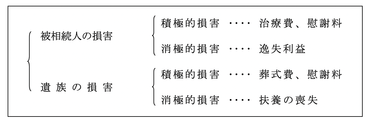 ある製造物の欠陥により、ある人の生命を侵害した場合、遺族の固有の損害と、死者について生じた損害ではあるが相続人に相続された損害の2つに分けることができます。