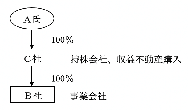 A氏が100%株式を保有する事業会社B社について株式移転を行い持株会社C社を設立します。持株会社C社の株式の評価額を低下させるためにC社において収益不動産の購入を行います。事業会社B社の財務内容に影響を与えずに対策を行うことができます。