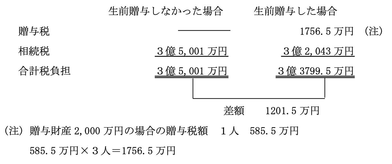 この場合の相続税の限界税率は 55%となっており、この限界税率よりも低い贈与税の平均税率での生前贈与を行うとして、例えば贈与税の平均税率 29.27%である 2,000 万円を3人の子にそれぞれ贈与を行ったときの、相続税負担と贈与税負担と の比較は以下のようになります。