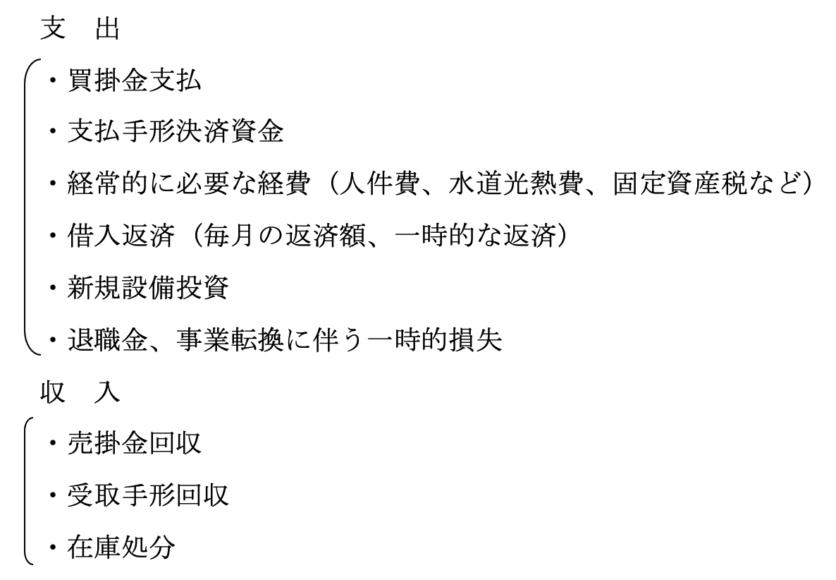 既存事業の縮小又は閉鎖から新規事業の立ち上げまでに、 ある程度の期間が必要であり、 さらに新規事業が軌道に乗るまでの事を考えると、 相当期間を見込む必要がありますので、 その期間の資金繰りを綿密に作っておかなければなりません。 資金繰りに盛り込むべき項目としては、