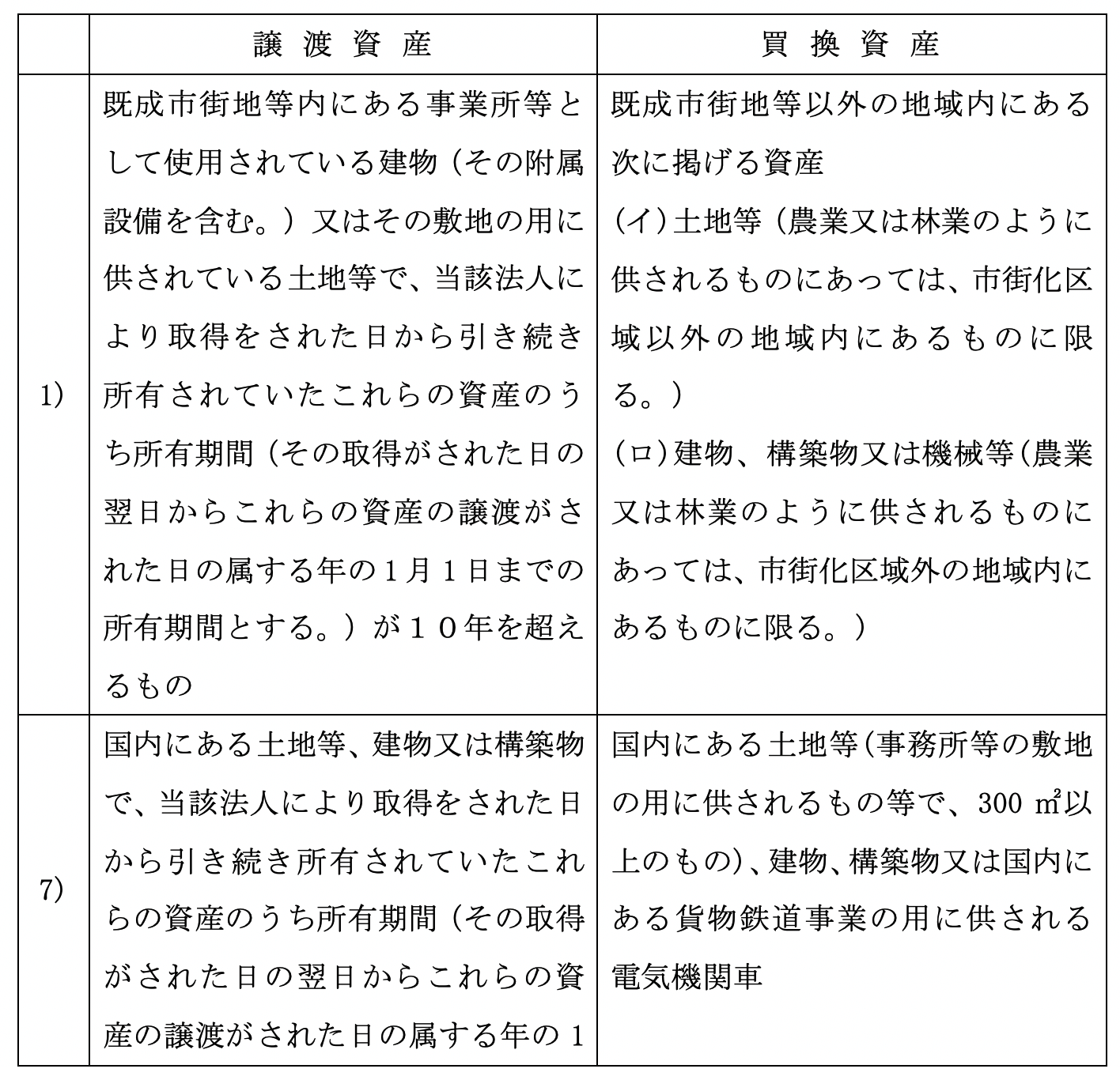 法人が平成32年3月31日までの間に、 所有する土地建物等を売却し、 売却した日を含む事業年度及び一定の期間内に要件に合致する土地建物等を取得し、 かつ取得の日から1年以内に、 法人の事業の用に供した場合は、 譲渡益の80%までの課税が繰延べられます。 (租税特別措置法65条の7)
