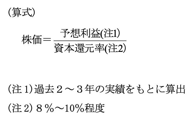 予想利益を一定の資本還元率で割引いて、 収益還元価額を算出します。