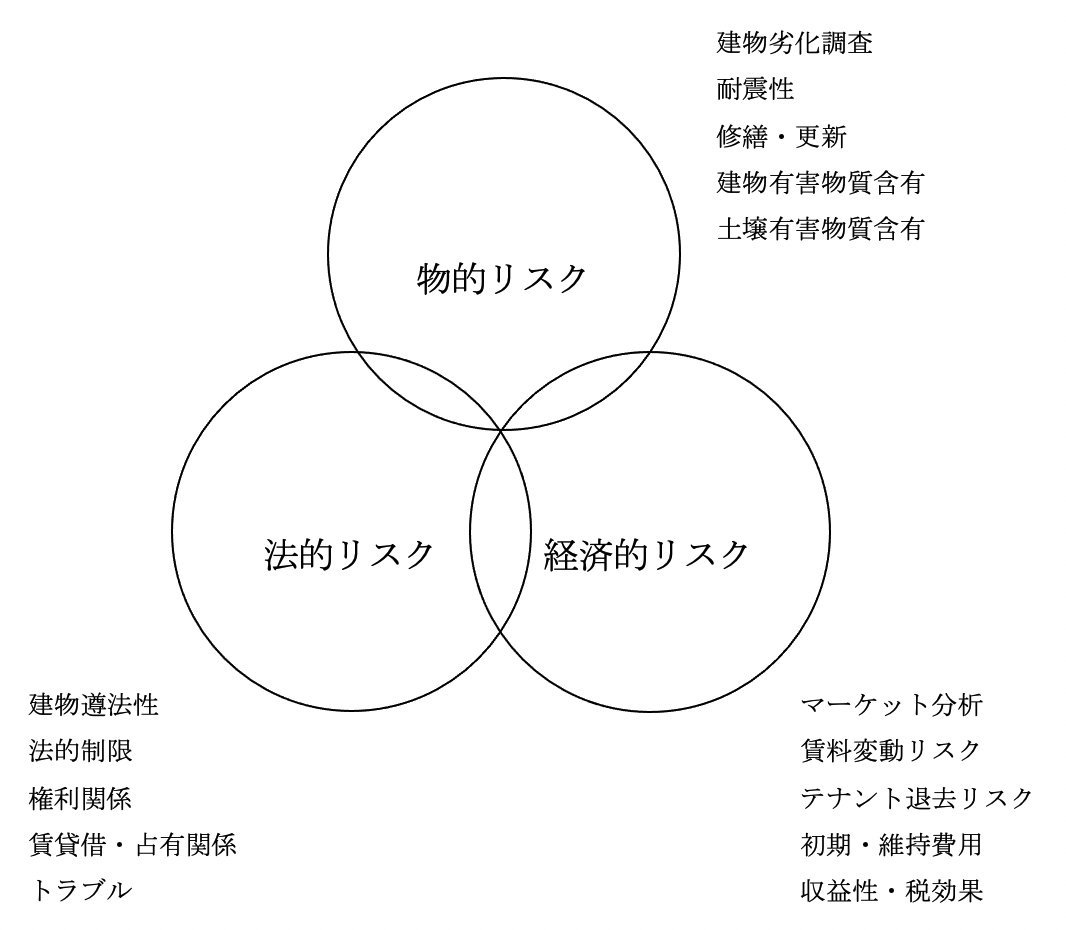 デューデリジェンスとは、「投資対象不動産の価値やリスクを明らかにするために実施する詳細かつ多角的な調査・評価」と定義され、不動産投資を行う際に予想される様々なリスクを「物的リスク」「法的リスク」「経済的リスク」の三つの側面に分けて調査分析し、対象不動産の正確な価値をレポーティングする作業をいいます。