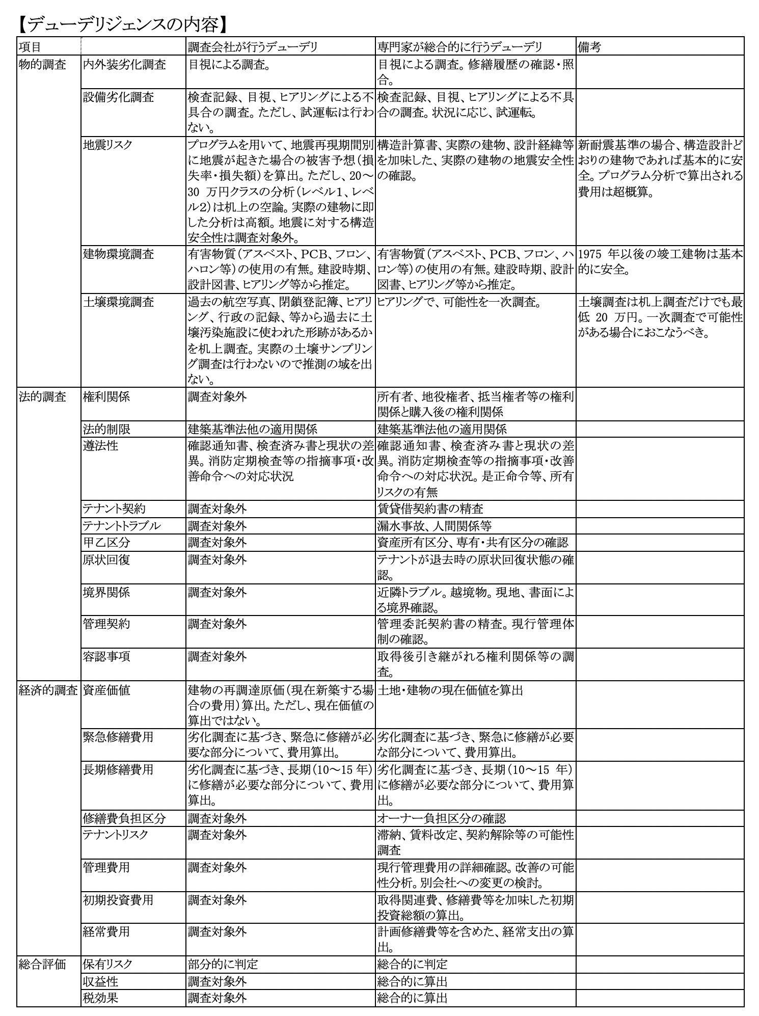 次頁に一般的な調査会社が行うデューデリジェンスの内容と、専門家が総合的に行うデューデリジェンスの内容を示します。