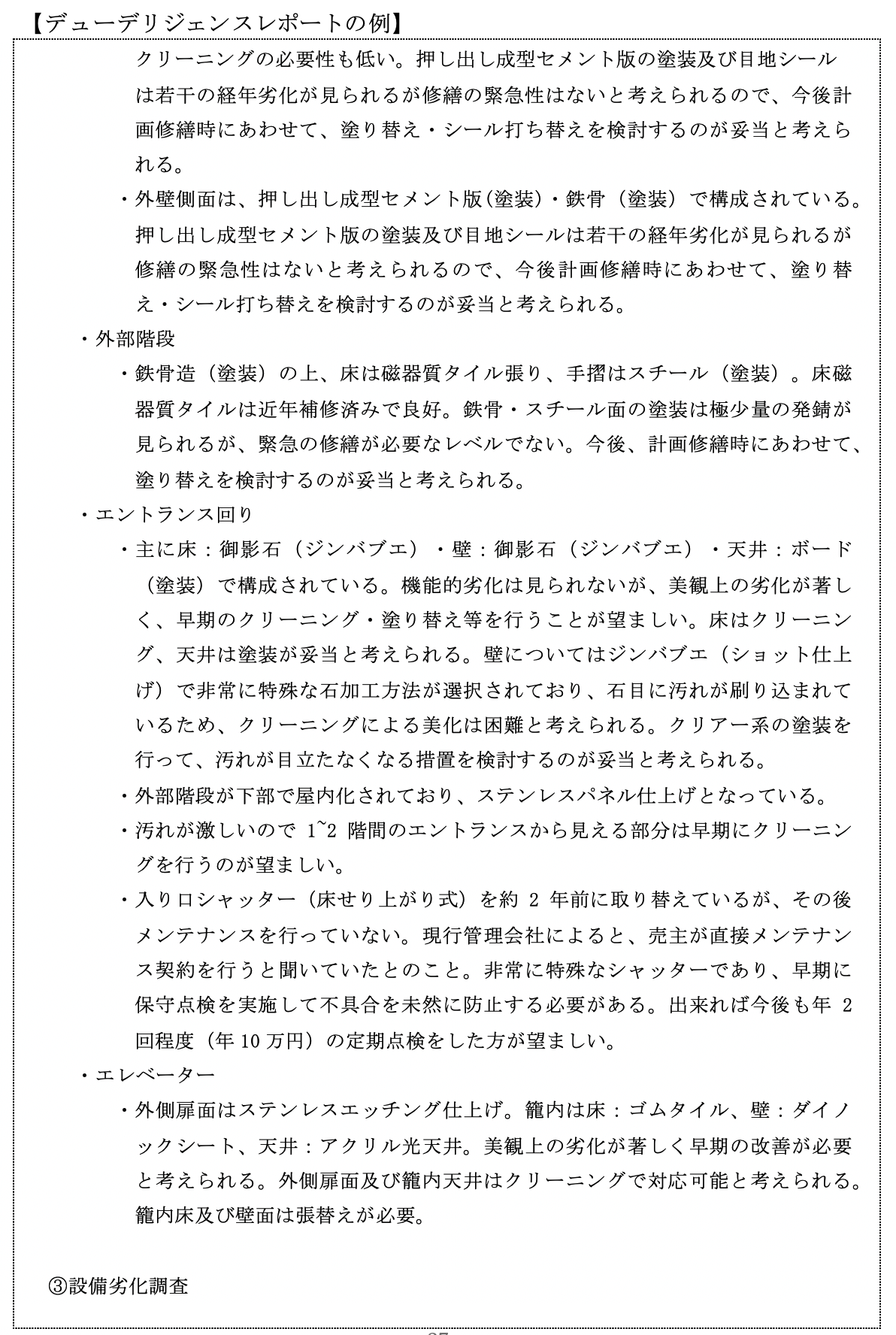 これらの会社はもともと建築、構造、設備が取り扱い分野であり、これらの会社が作るデューデリジェンスレポートは、物的リスクの調査・分析が主体となっています。