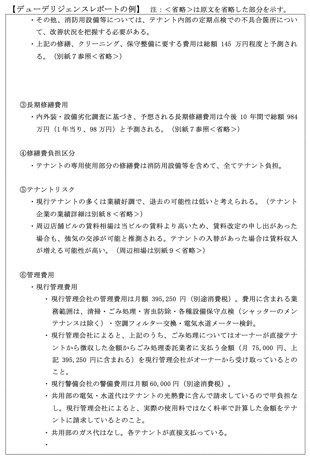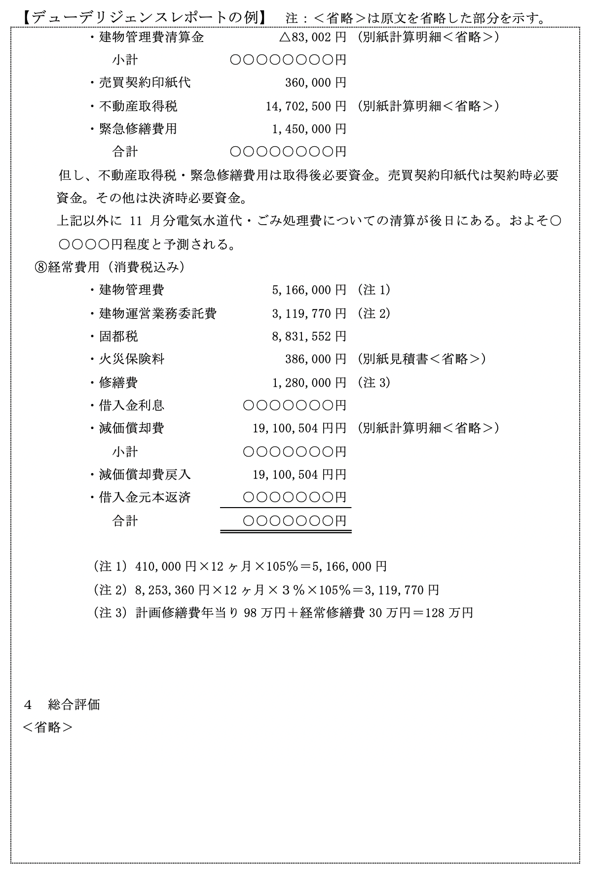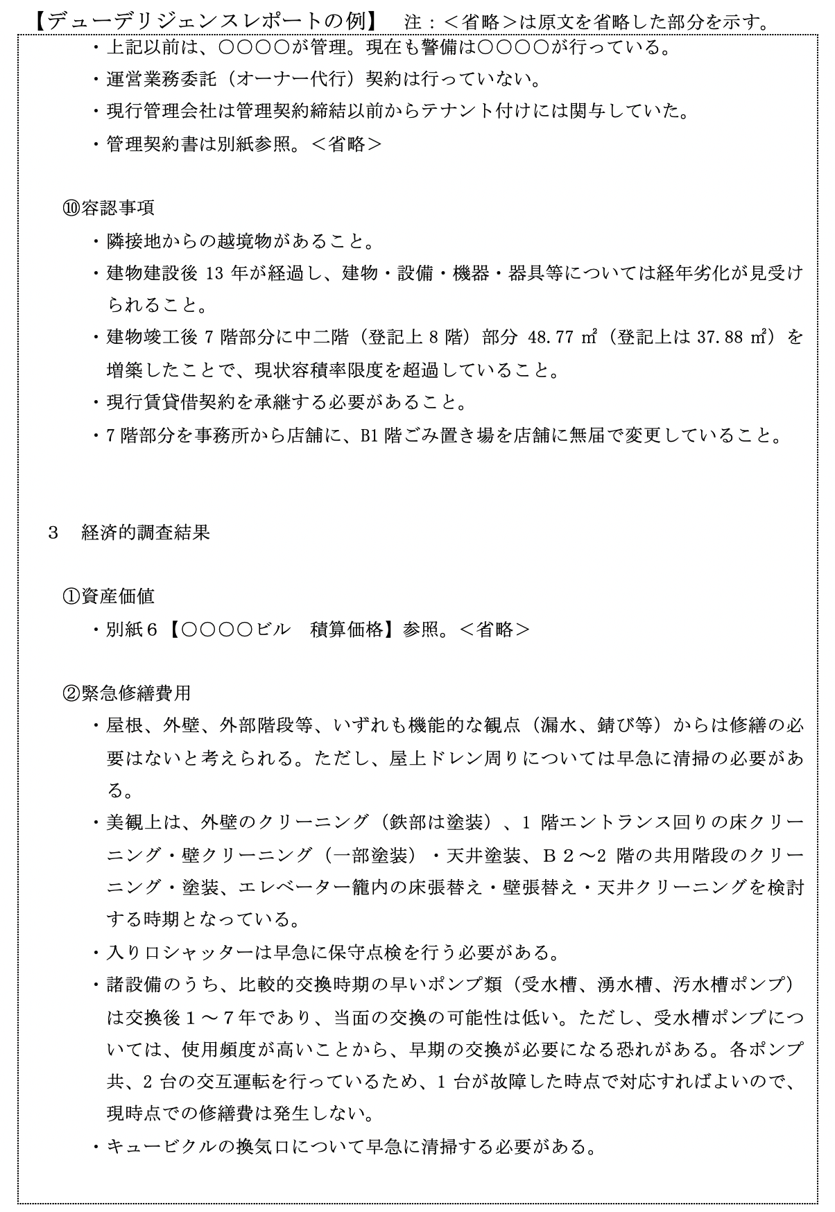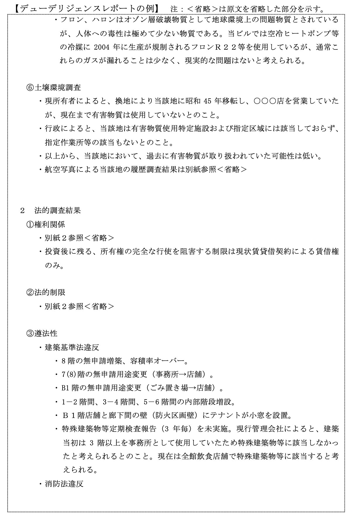 次々頁以降に総合的なデューデリジェンスレポートの具体例を添付していますので、ご参照ください。
