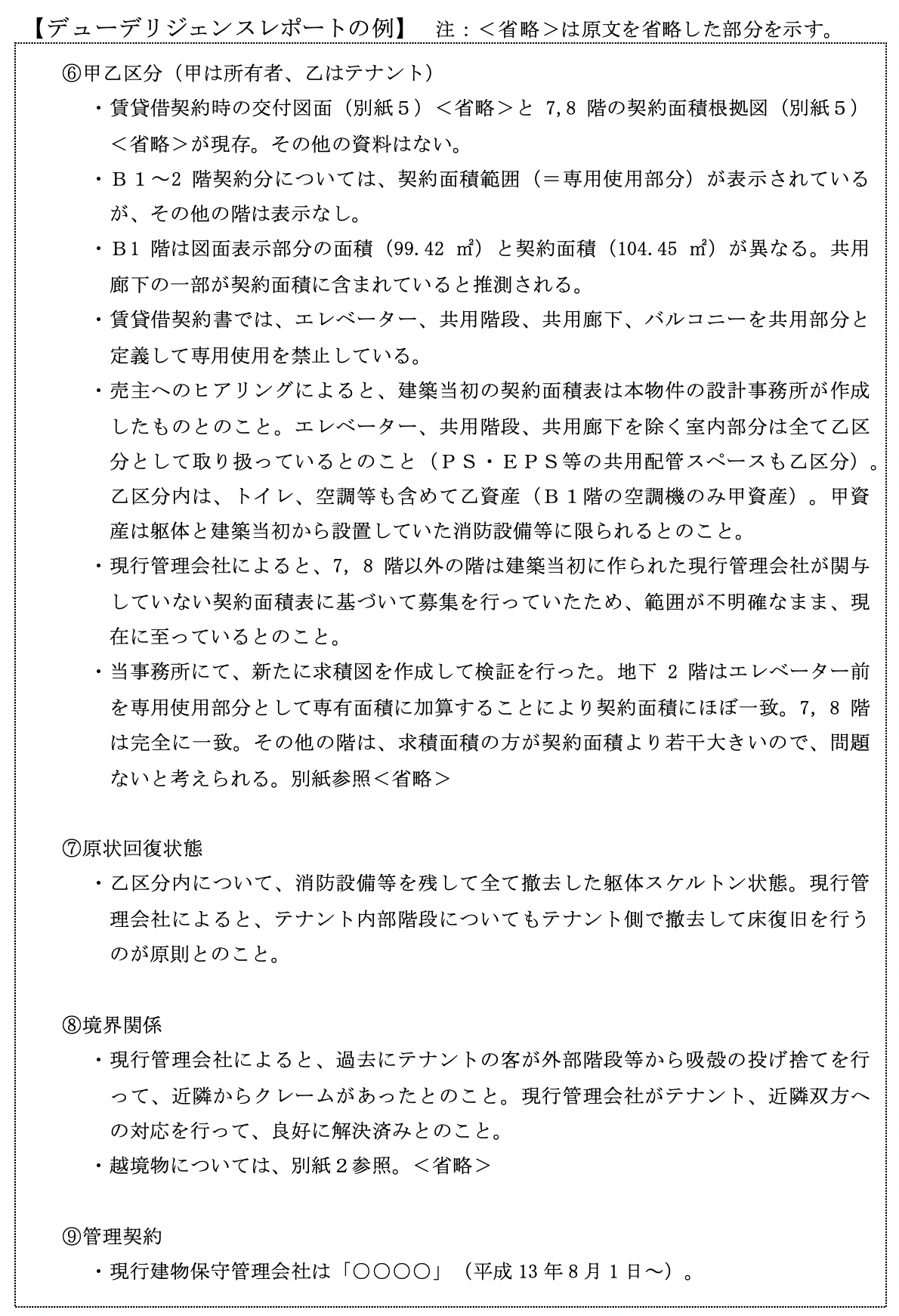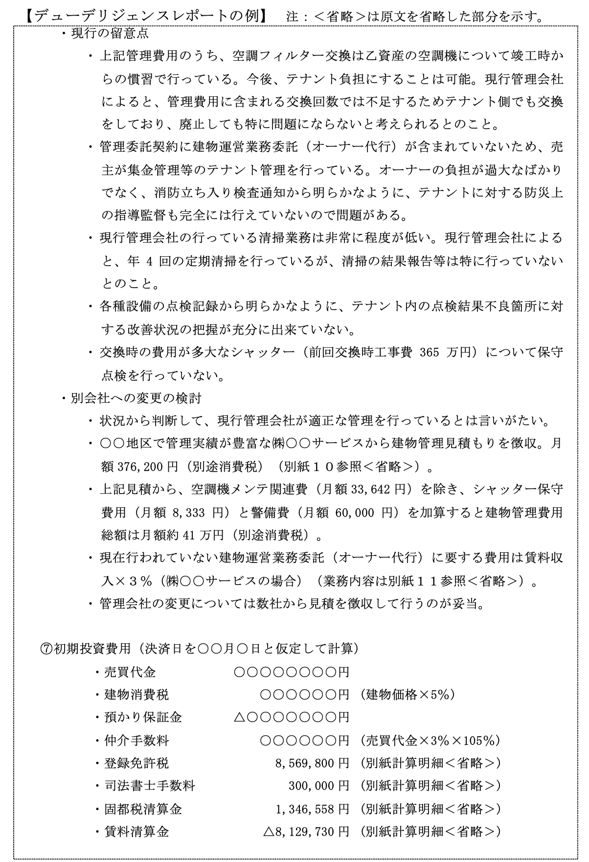 このようなリスクをあらかじめ察知し、投資前に売主側で排除させる、排除できない場合は売買価額に反映する、売買価額に反映できない場合は投資を中止する、等の投資判断をすることがデューデリジェンスの目的です.