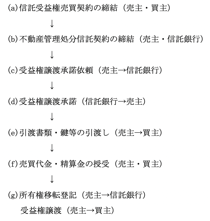 信託受益権売買契約の場合の、契約から売買決済引渡までの流れは下記のかたちとなります。