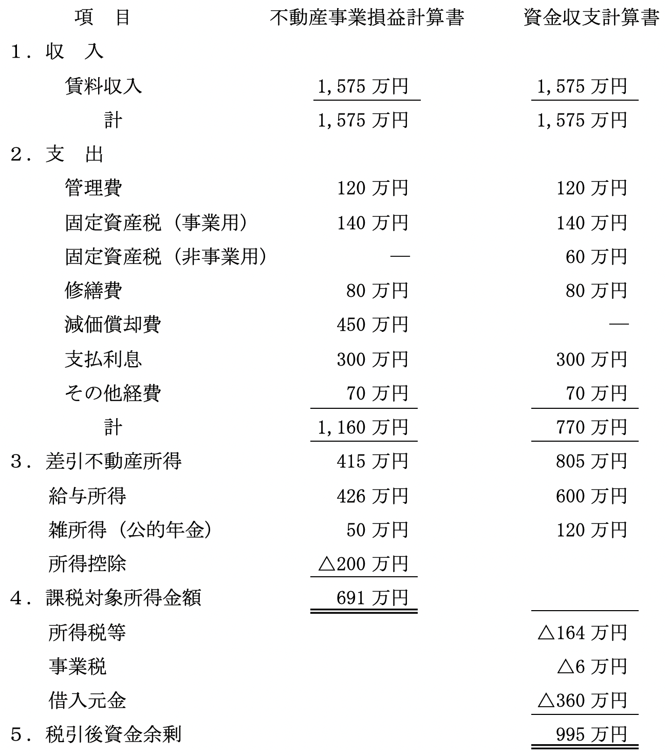 不動産事業損益計算書を基に、 不動産事業以外に経常的に発生する収入と不動産事業以外の支出 (例えば自宅等の固定資産税) を加え、 支出を伴わない項目 (減価償却費など) を除き、 所得税等を差引き、 経常資金収支の金額を算出します。 これにより毎年経常的に発生する資金収支の余剰 (不足) 額を把握します。