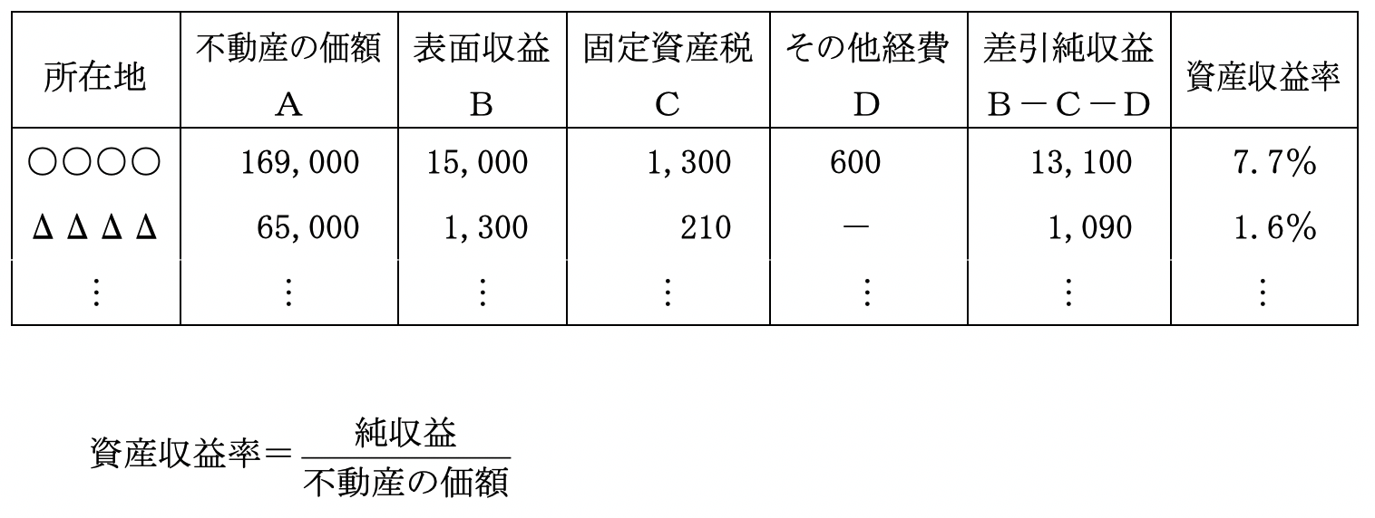 (イ)の収益を(ロ)の価額で除して、 不動産の価額に対する収益の割合である資産収益率を算出します。 これにより、 ストックとしての不動産がどれだけの収益を生んでいるかを把握します。