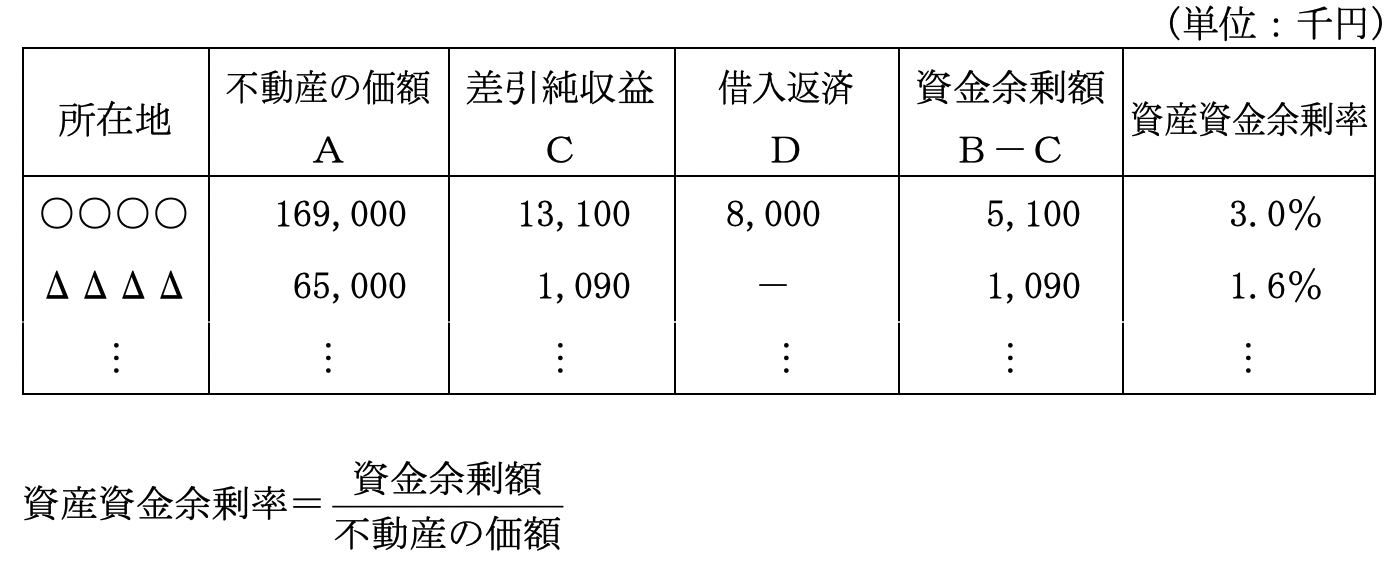 個々の不動産の純収益より借入金の元利返済額を差引き、 個々の不動産毎の資金余剰額を算出し、 これを不動産の価額で除して、 不動産毎の価額に対する資金余剰額の率を算出します。 これを一覧表にしたものが 「個々の不動産毎の資産資金余剰率一覧表」 で、 個々の不動産の資産資金余剰率を比較することができます。