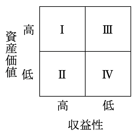 所有不動産の純収益を不動産の価額で除した資産収益率を 「資産価値」 の観点から、 下記の四つの分類のどれかに区分します。 資産価値が高いか低いかの判断は、 将来にわたっても収益性が高いか、 又は換金性が高いか、 又は自己使用での満足度が高いかのどれかで、 所有することに魅力があるかどうかを基準として行います。