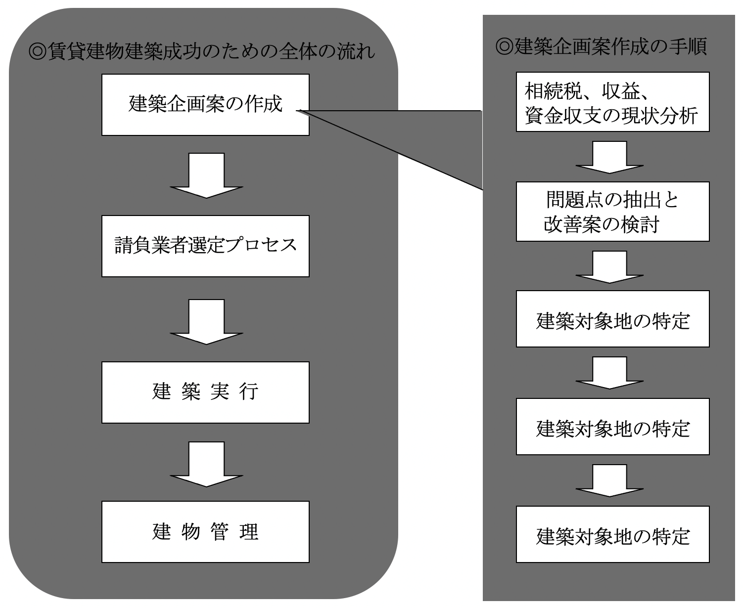 賃貸建物建築成功のための全体の流れを次ページに示します。 各段階の留意点は次のとおりです。