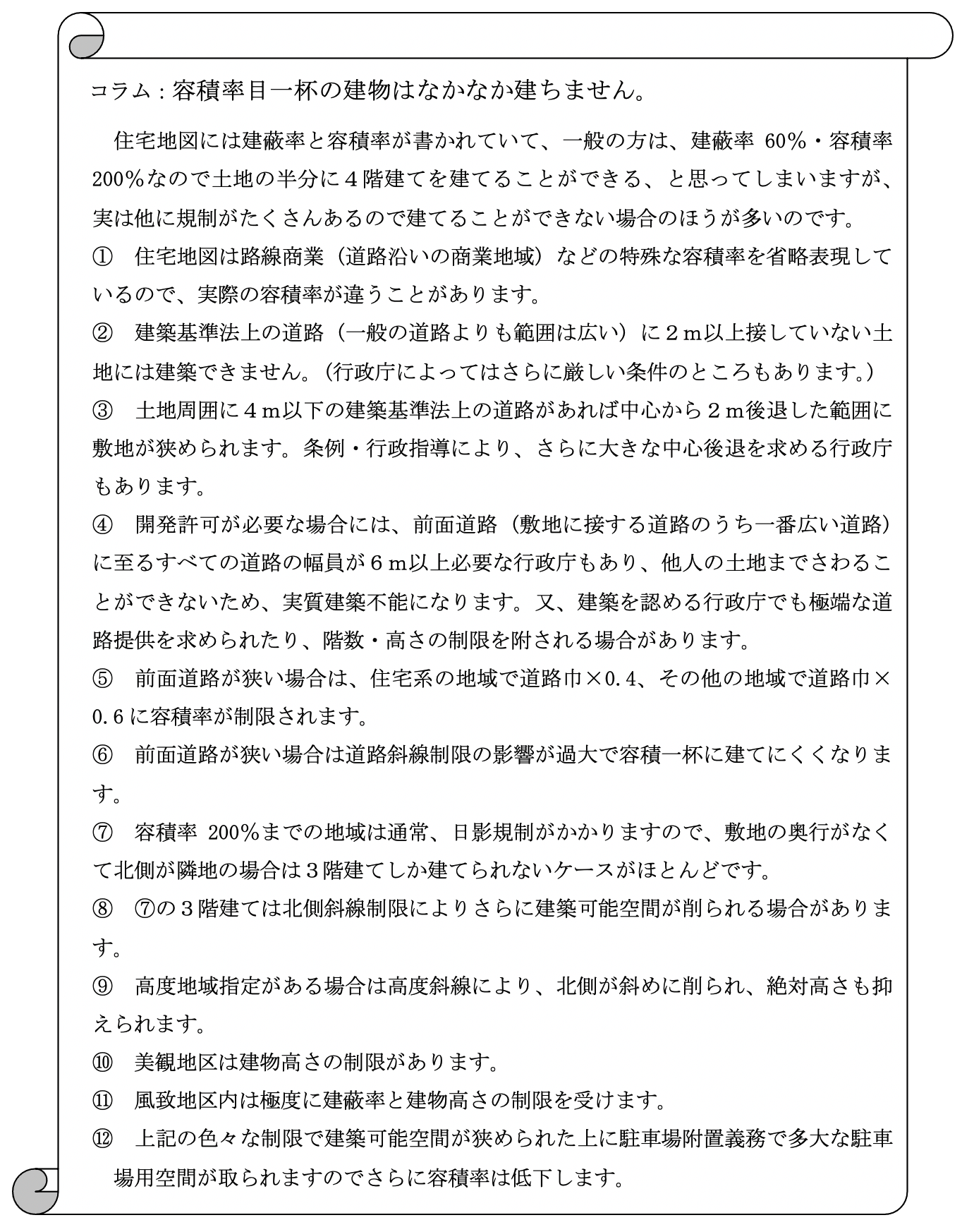 法的調査は、 建築対象地の法的規制の洗い出しをします (コラム参照)。 建築の規制は行政庁ごとに全く異なりますので官庁調査を入念に行います。