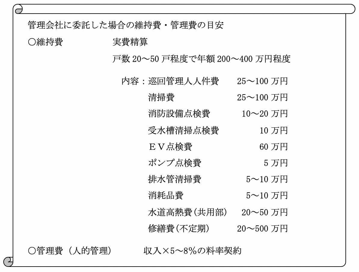 毎年の手取り収入は、賃料収入から、固定資産税等の税金、借入金元利返済、維持管理費を差し引いた金額となりますので、手取り収入を増やすために維持管理コストを抑えることに気を取られがちです。