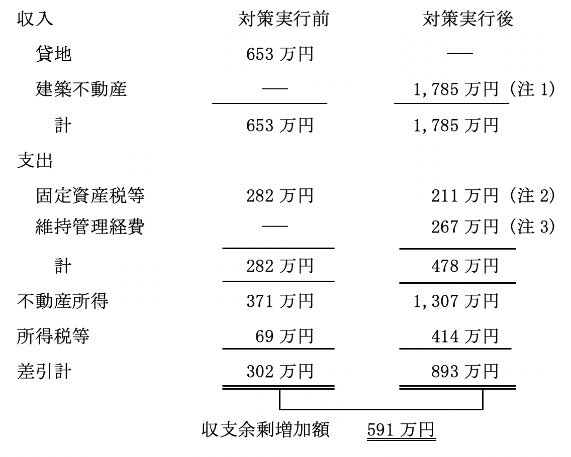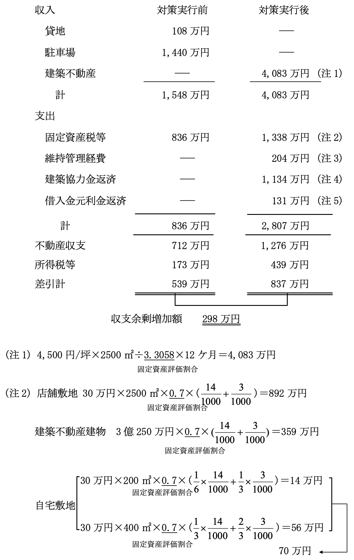 貸地の明渡しを行い、明渡後の更地と駐車場に定期借地権を設定する今回の事例では、相続税の軽減効果は殆どありませんが、資金負担なしで土地の有効活用ができ、収益性の面では対策前より年間500万円収支余剰額が増加します。また、定期借地契約期間の終了後には更地で土地が返還されるのも大きなメリットです。