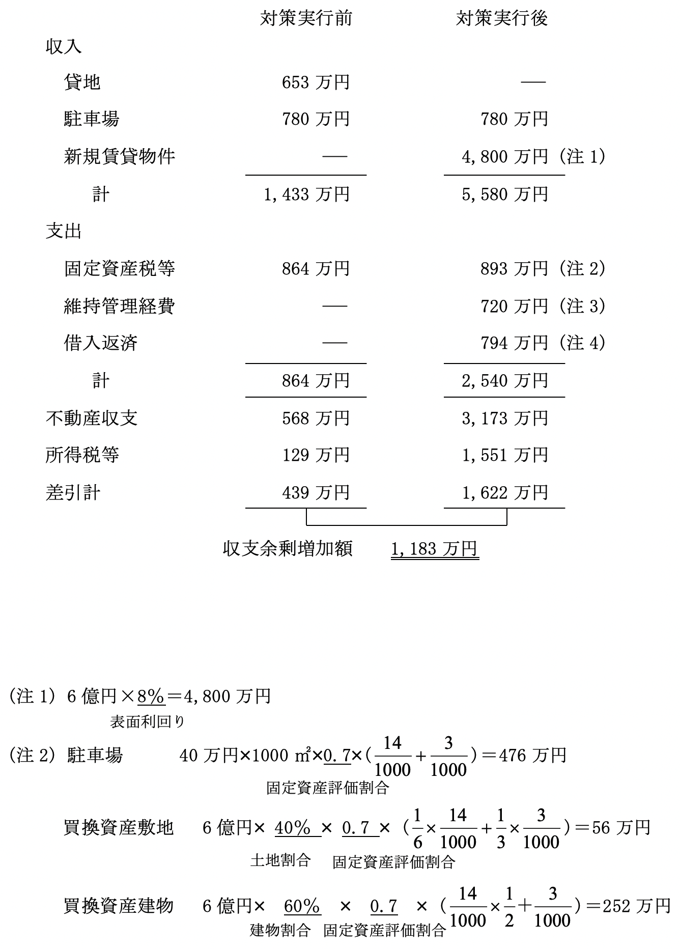 低収益しか生まない貸地を売却し、売却額と同額の買換資産を購入する今回の事例では、相続税が3億5,035万円から2億3,628万円に1億1,406万円も軽減する効果とともに、収支余剰額が1,844万円と大幅に増加する収益性の向上効果が得られます。