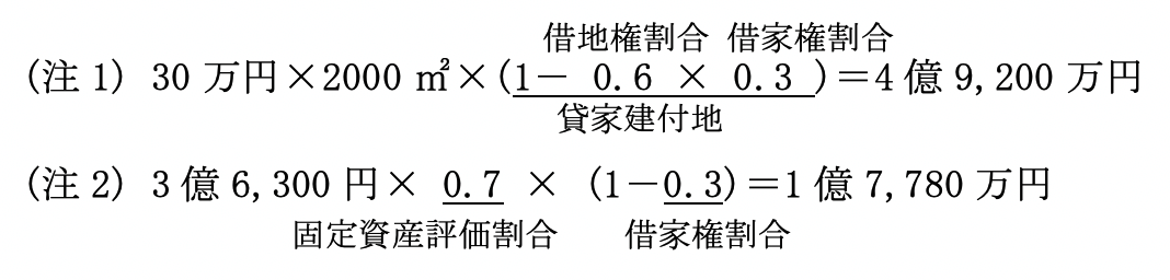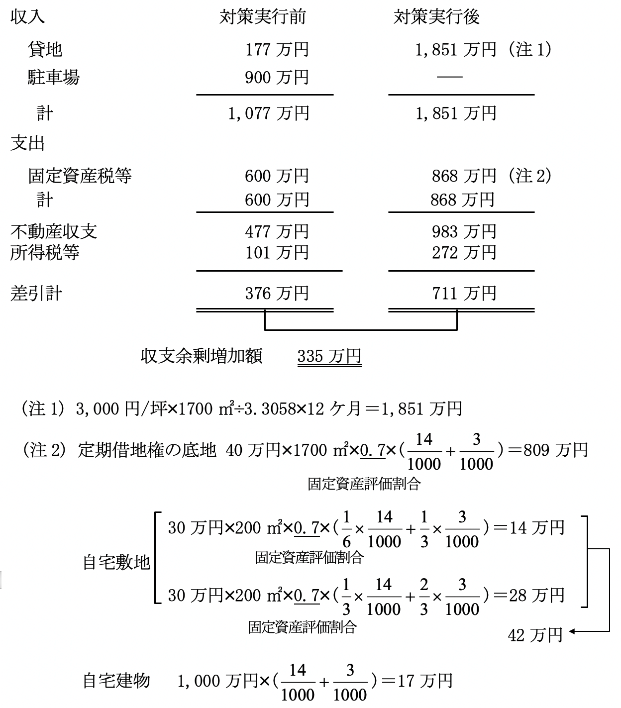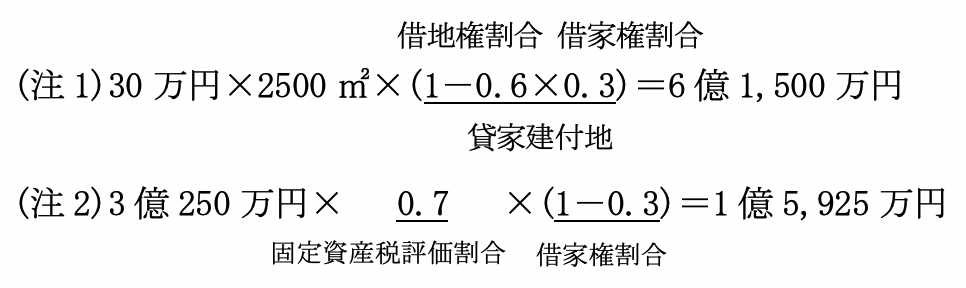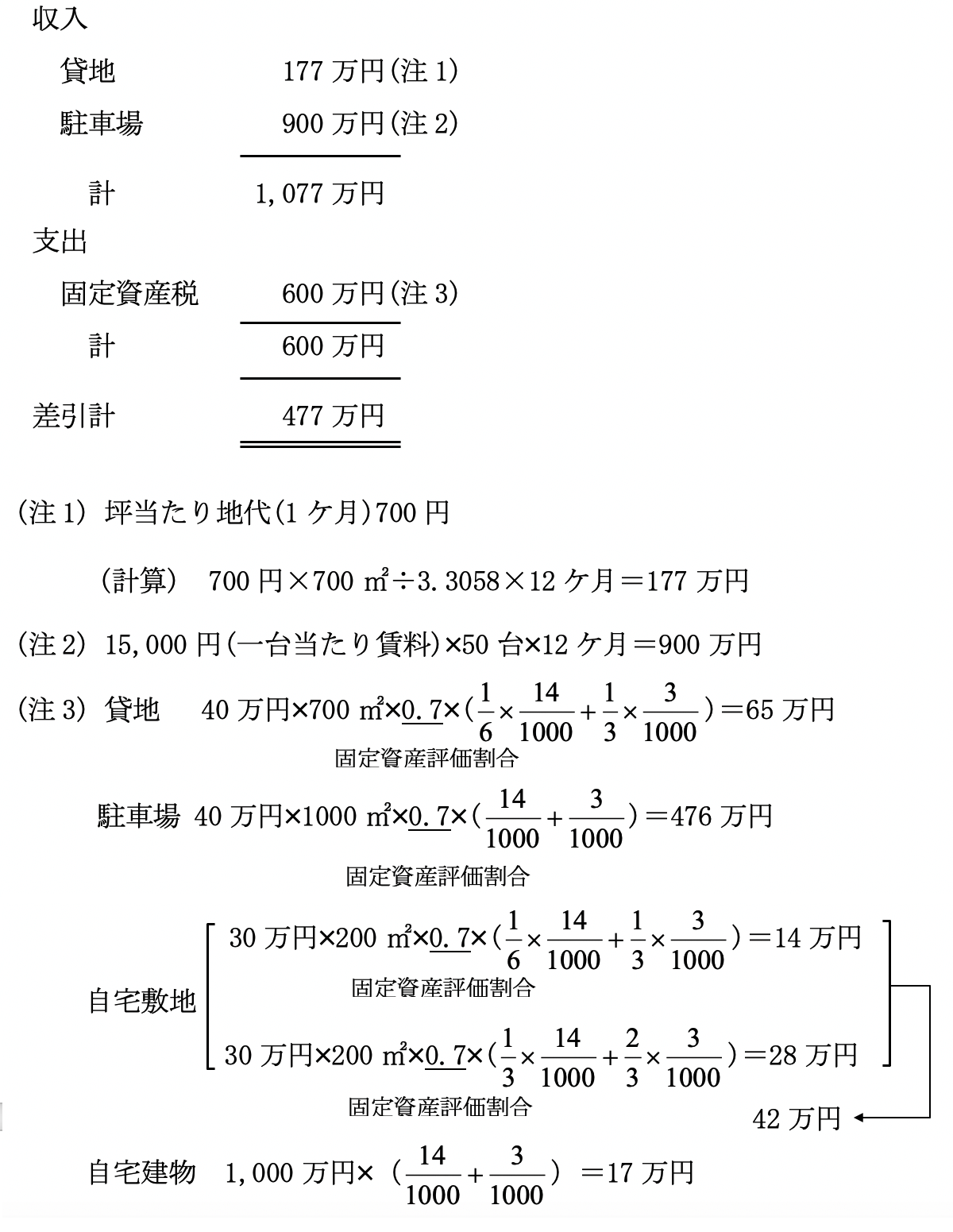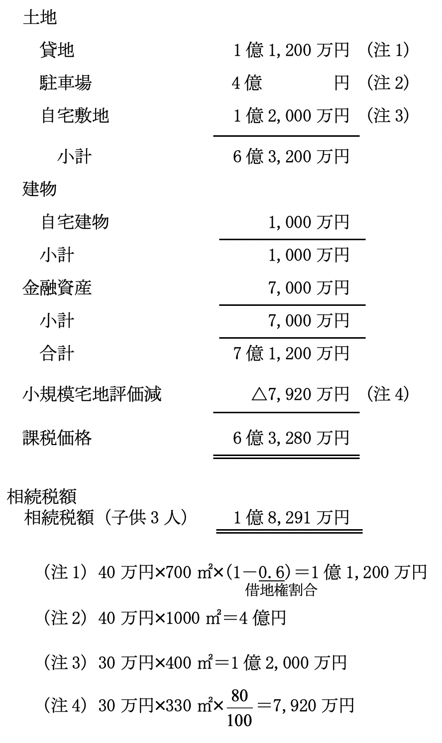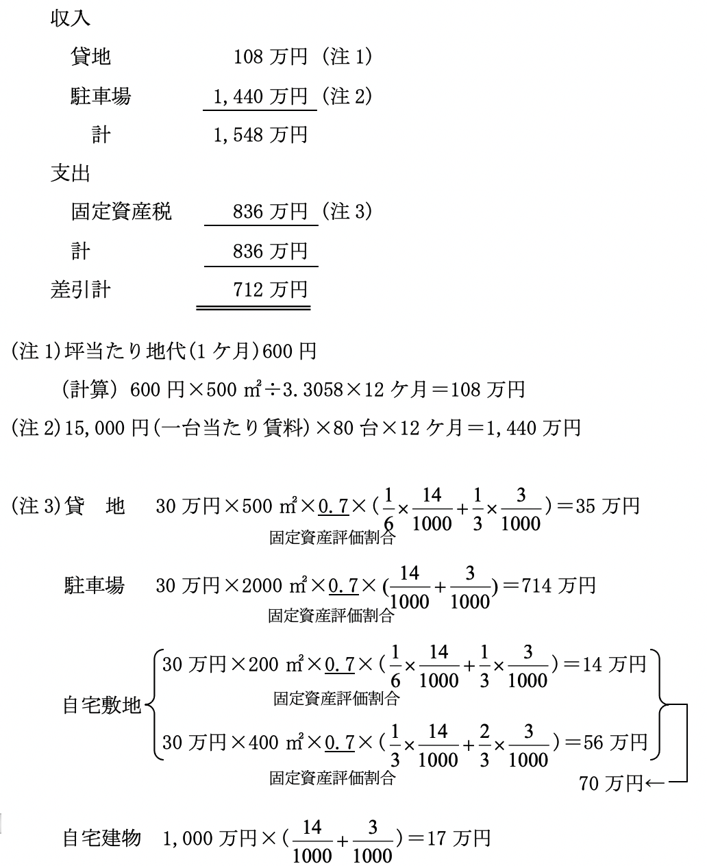 貸地700㎡、駐車場1000㎡、自宅400㎡、土地の時価は自宅は路線価で更地価額㎡当り30万円、その他は路線価で更地価額㎡当り