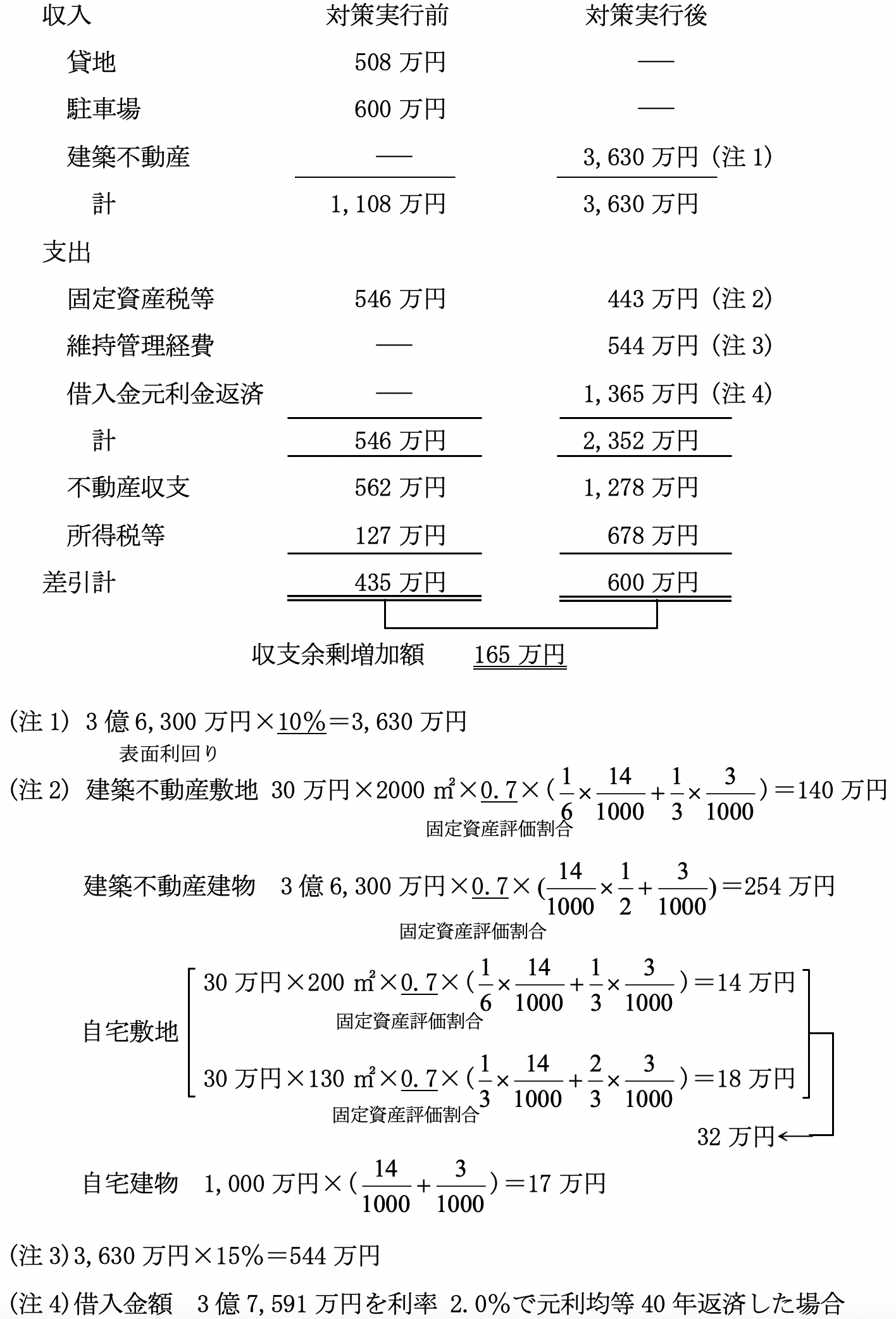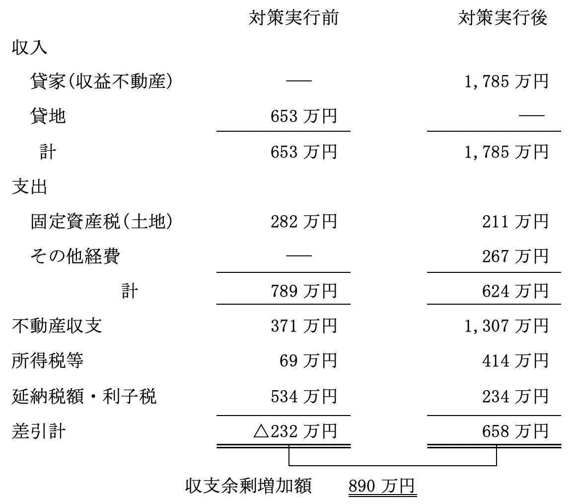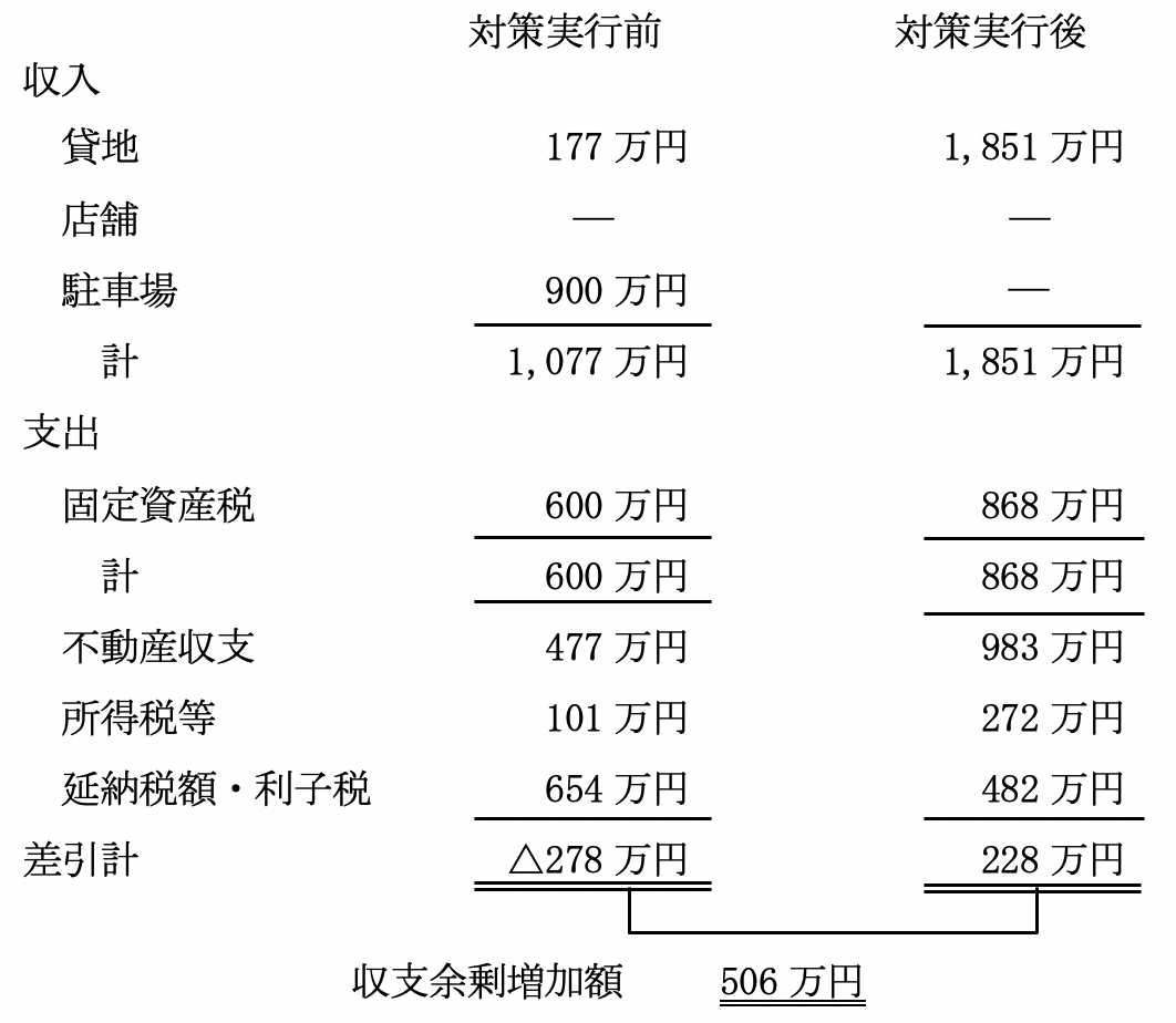 貸地の明渡しを行い、明渡後の更地と駐車場に定期借地権を設定する今回の事例では、相続税の軽減効果は殆どありませんが、資金負担なしで土地の有効活用ができ、収益性の面では対策前より年間500万円収支余剰額が増加します。また、定期借地契約期間の終了後には更地で土地が返還されるのも大きなメリットです。