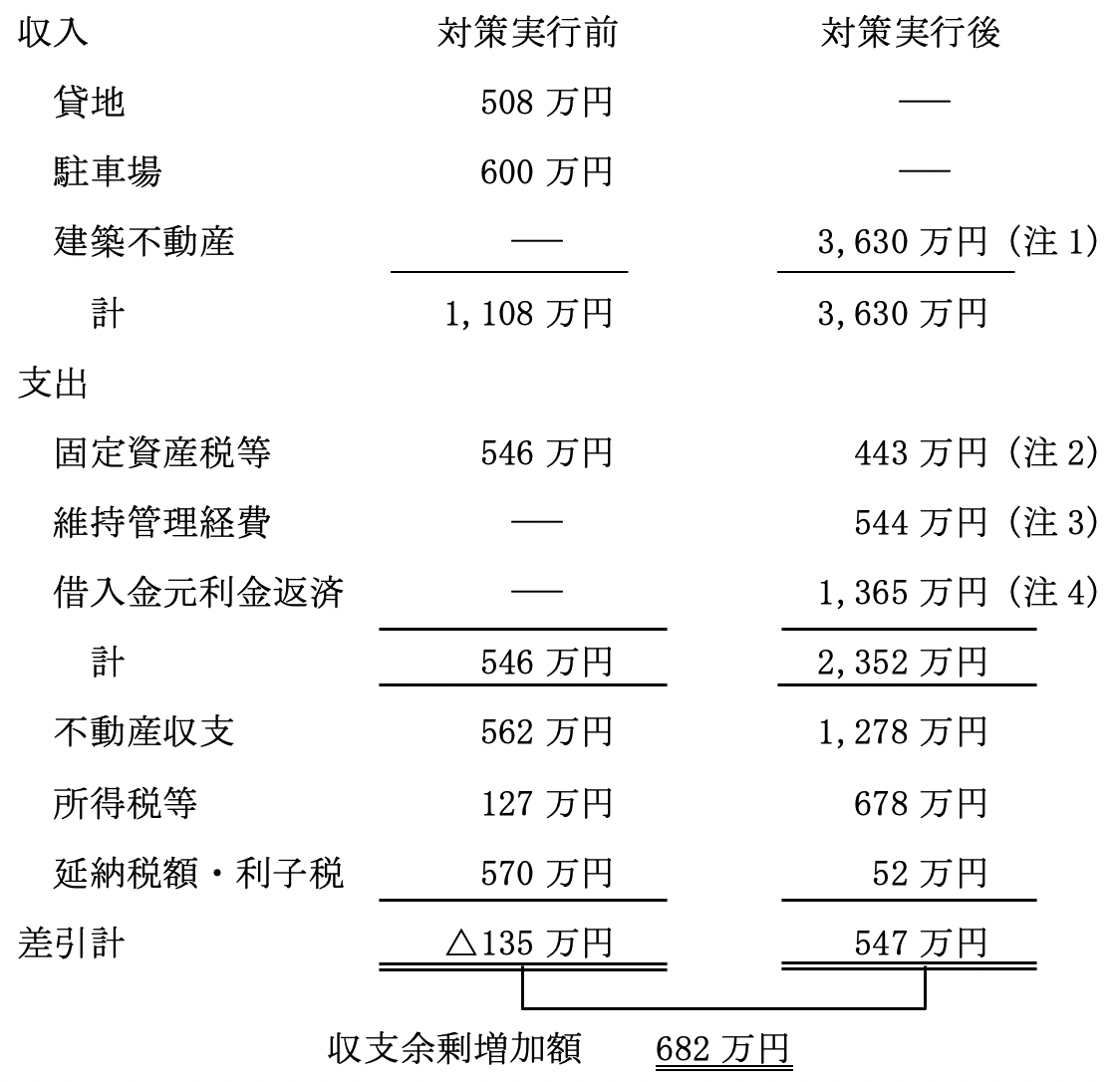 貸地の一部明渡しと一部売却を行い、明渡後の更地と駐車場に建物を建築する今回の事例では、相続税が1億4,832万円から5,909万円に8,923万円も軽減する大きな効果があり、収益性も収支余剰額が682万円と大幅に増加します。低収益の貸地と駐車場を高収益不動産に変えることでこのような大きな効果が発生します。