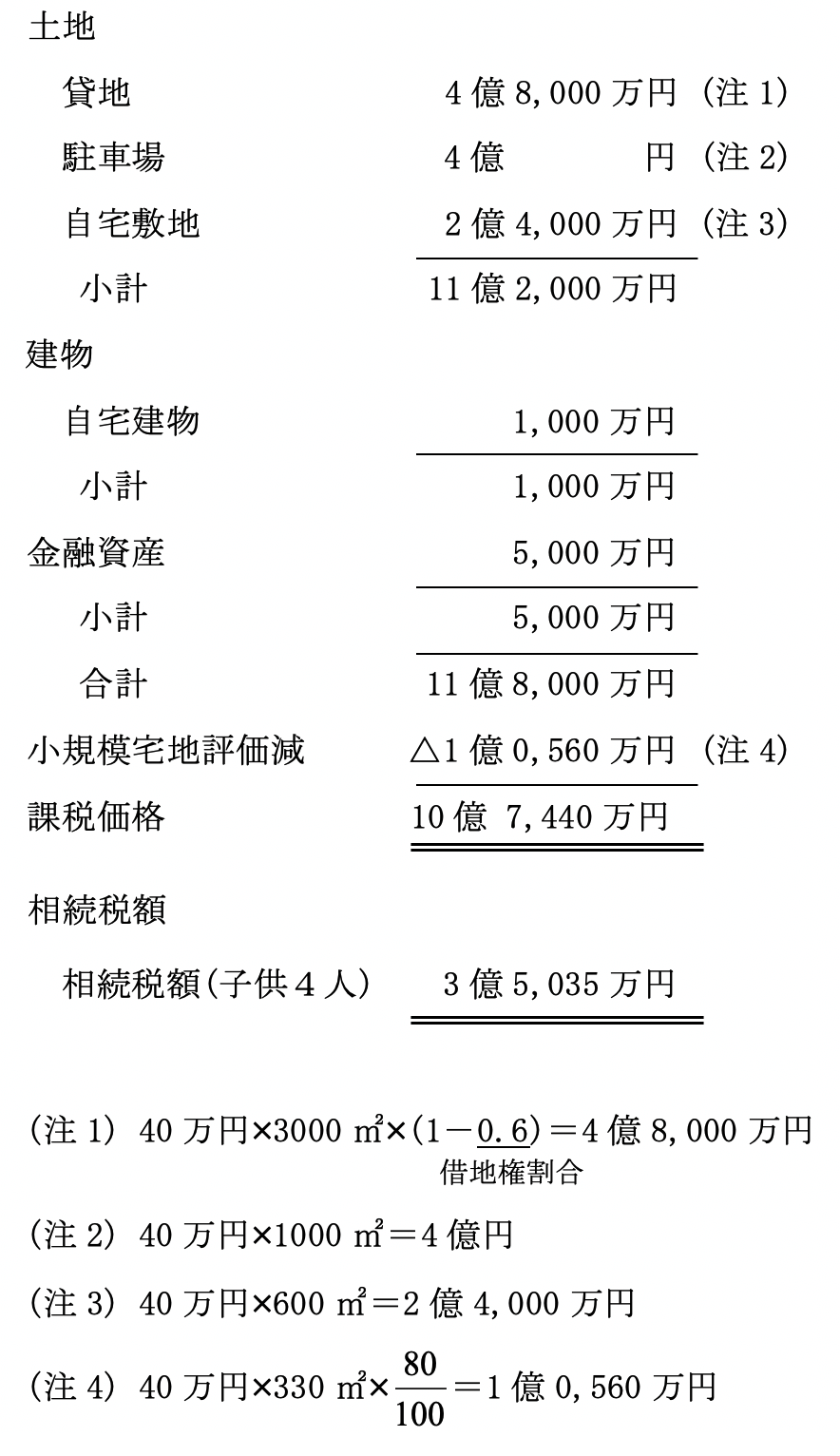 貸地3000㎡、駐車場1000㎡、自宅600㎡、土地の時価はすべて